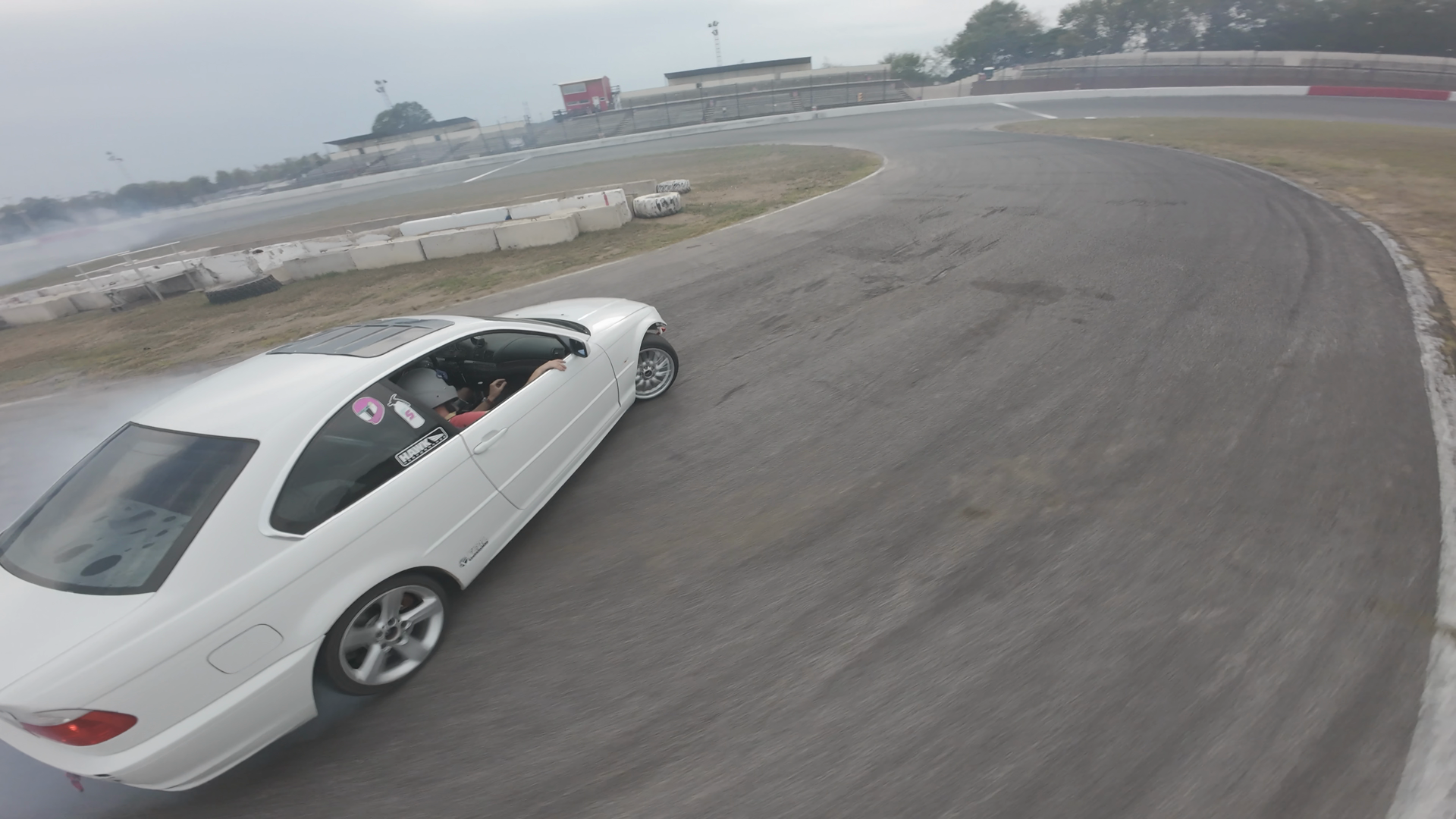 A white sedan is drifting on a racetrack, navigating a curved section of the track with precision. The car, which appears to be a BMW, is angled sharply against the curve, showcasing its dynamic capabilities. The driver, seated inside the vehicle, appears focused, with one hand partially visible on the control. The surrounding environment features a section of the racetrack bordered by barriers and sparse greenery in the background, under an overcast sky. The excitement level is moderate, reflecting a controlled drift rather than a high-speed event. No visible brand logos or specific sponsor stickers are present on the car.