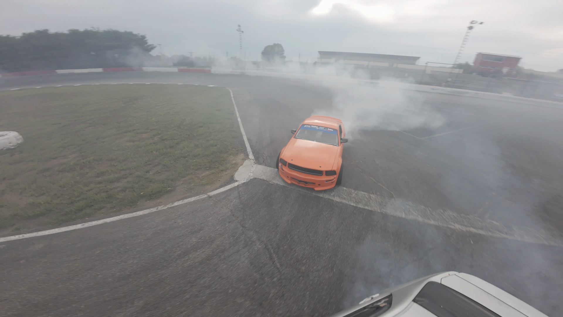An orange Mustang is drifting on a track, emitting thick smoke from its tires, showcasing a high-speed cornering maneuver. The scene takes place in a wet area, indicated by the dark gray wet asphalt and overcast sky. The car's front is angled slightly inward, and the driver is not visible. The video appears to be shot from a drone, providing a close overhead view of the car as it navigates the corner on the track with a grassy infield in the background.