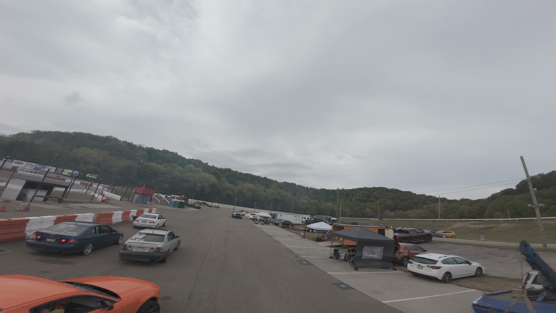 The image shows a large, open parking lot adjacent to the Midvale Speedway, a short circuit located in Midvale, Ohio. The lot is filled with multiple cars, including a notable orange vehicle and a white sedan, parked in lines. On the right side of the image, equipment and tents are set up, likely for event-related activities or equipment checks. Several people can be seen scattered around the lot, possibly attendees or event staff. The background features a road with a railing and hills with dense trees, indicating an overcast day with gray skies. The atmosphere suggests active preparation around the speedway for an upcoming drift event.