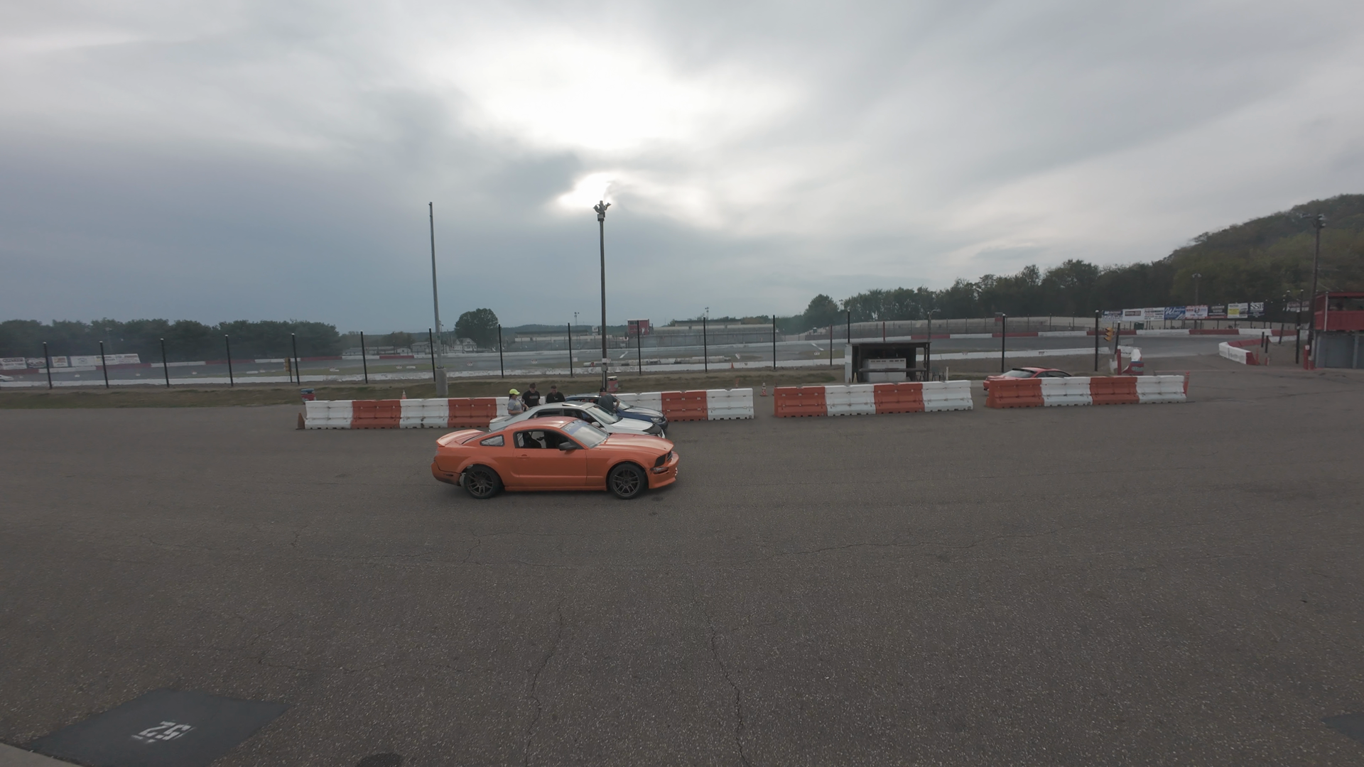 An orange Ford Mustang is centered in the frame on a racetrack at Midvale Speedway. The car appears to be stationary or moving very slowly. Several individuals, including a driver and a passenger, are seated in the car. The weather is overcast with a grey sky. In the background, there's a fenced-off area with some trees and buildings partially visible. The environment looks quiet with no other vehicles or significant activity besides the car and people. No damage is visible on the car's exterior.