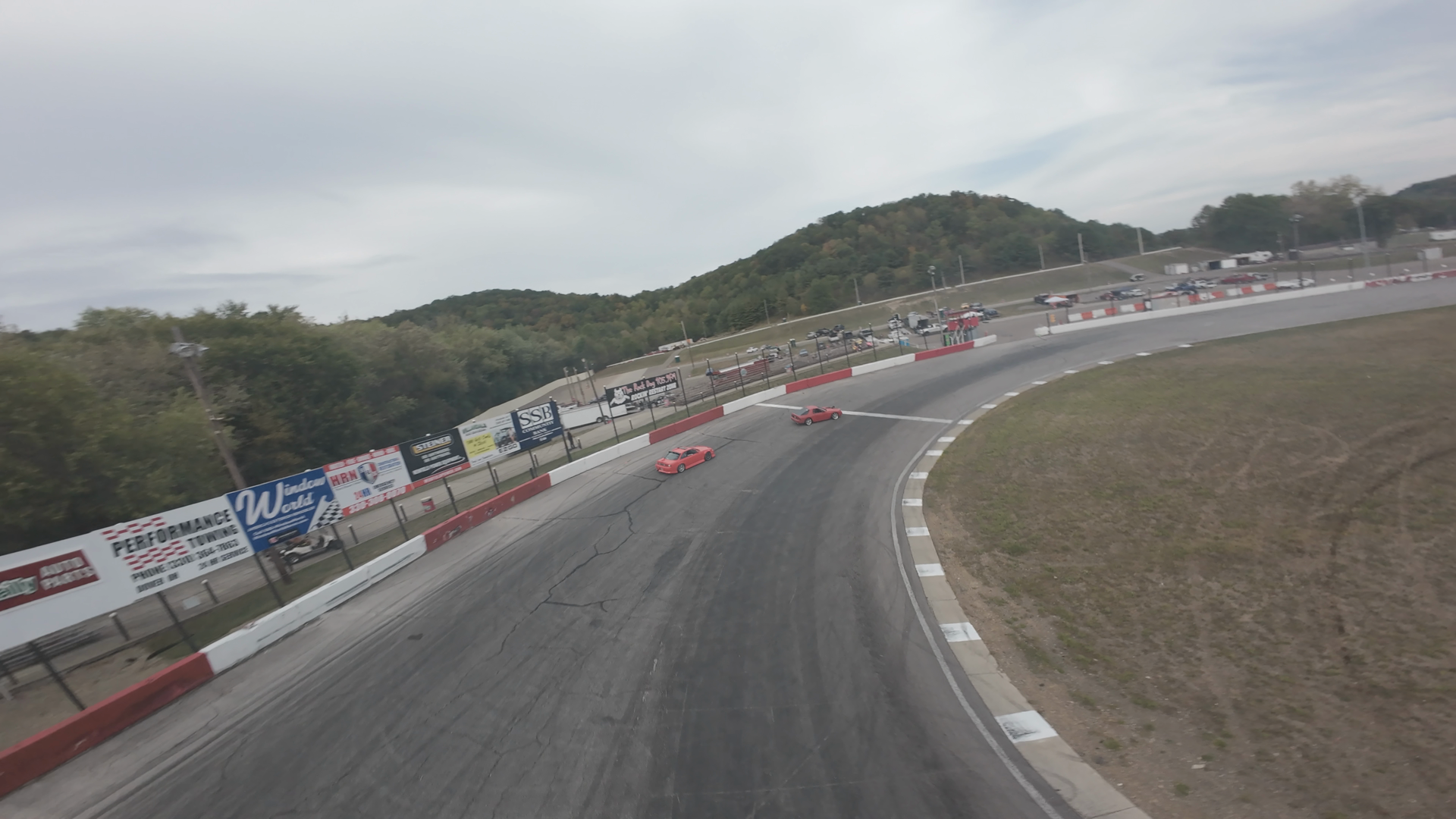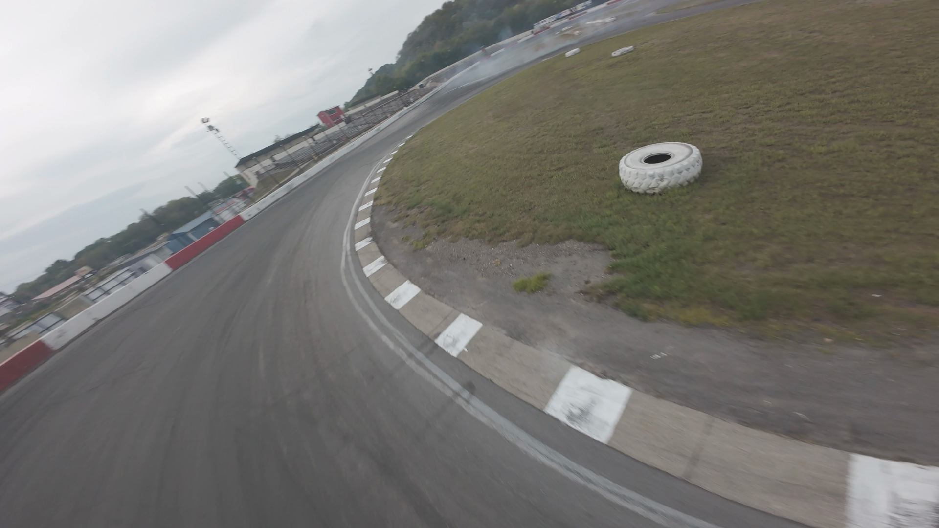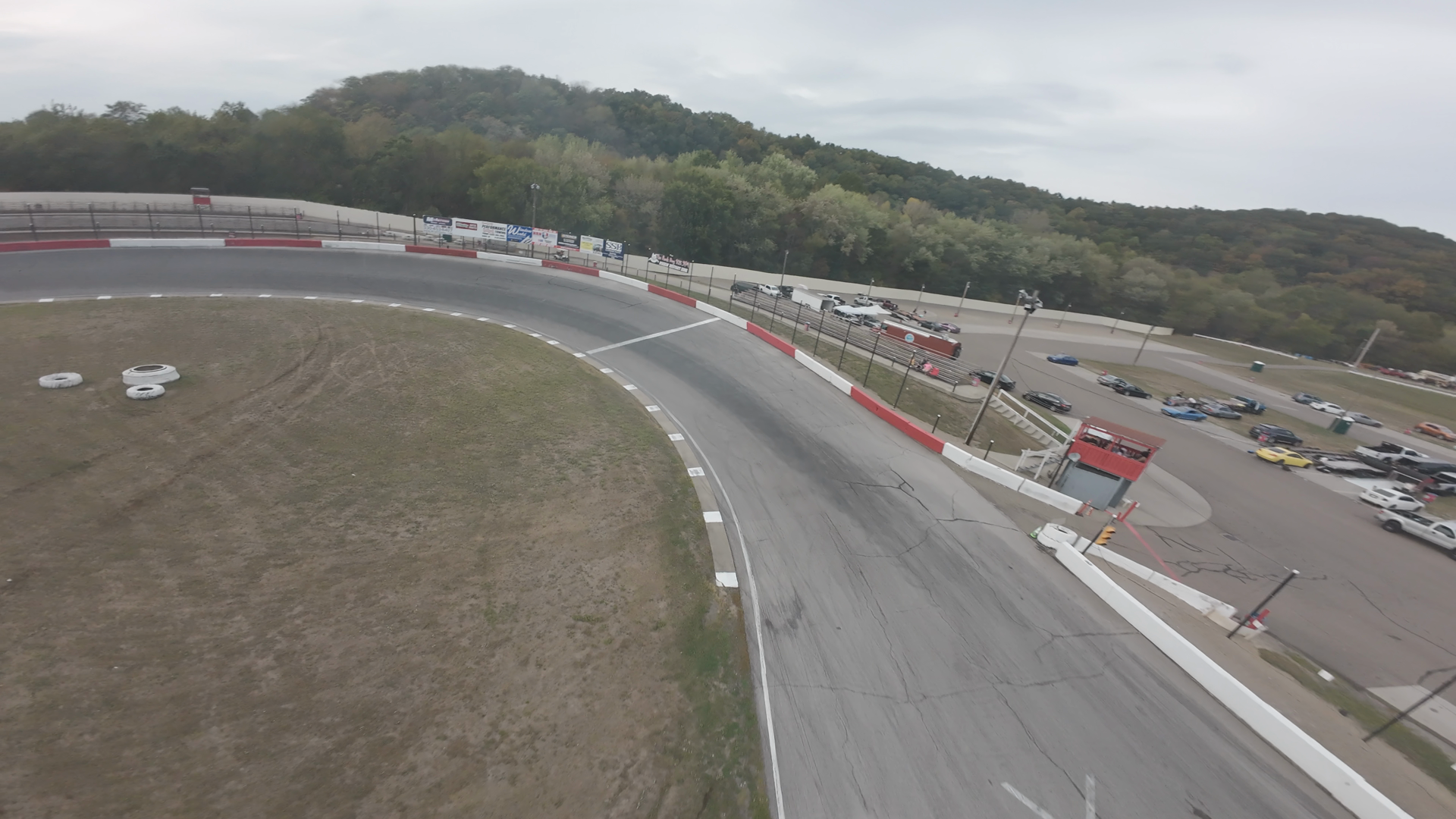 This image shows an aerial view of a curved section of a race track at Midvale Speedway, with white checkered line markings on the asphalt. The surrounding area includes grassy patches, a tire laid on the grass, and some structures and fencing in the distance under an overcast sky. The track is bordered by red and white barriers. This segment of the race track appears to be relatively flat, with no significant elevation changes and minimal vehicle activity visible in the scene.