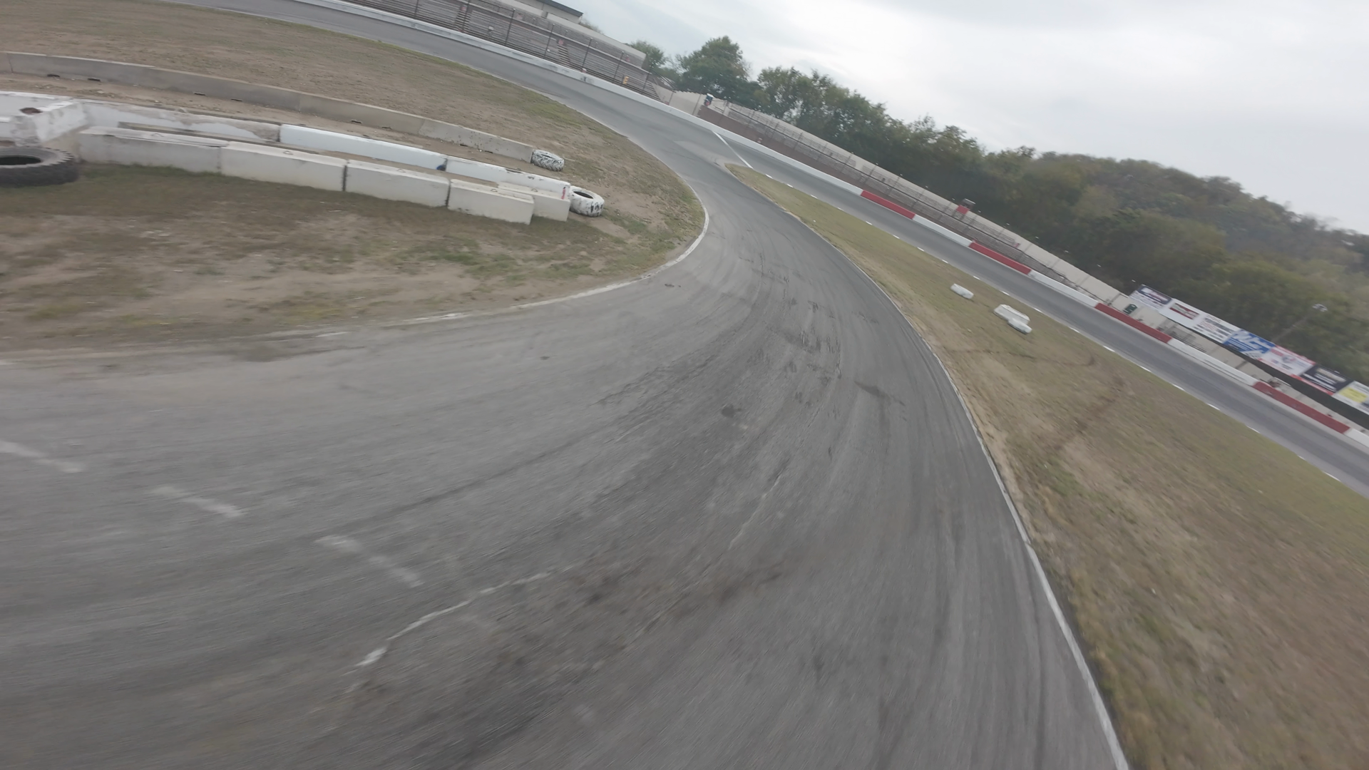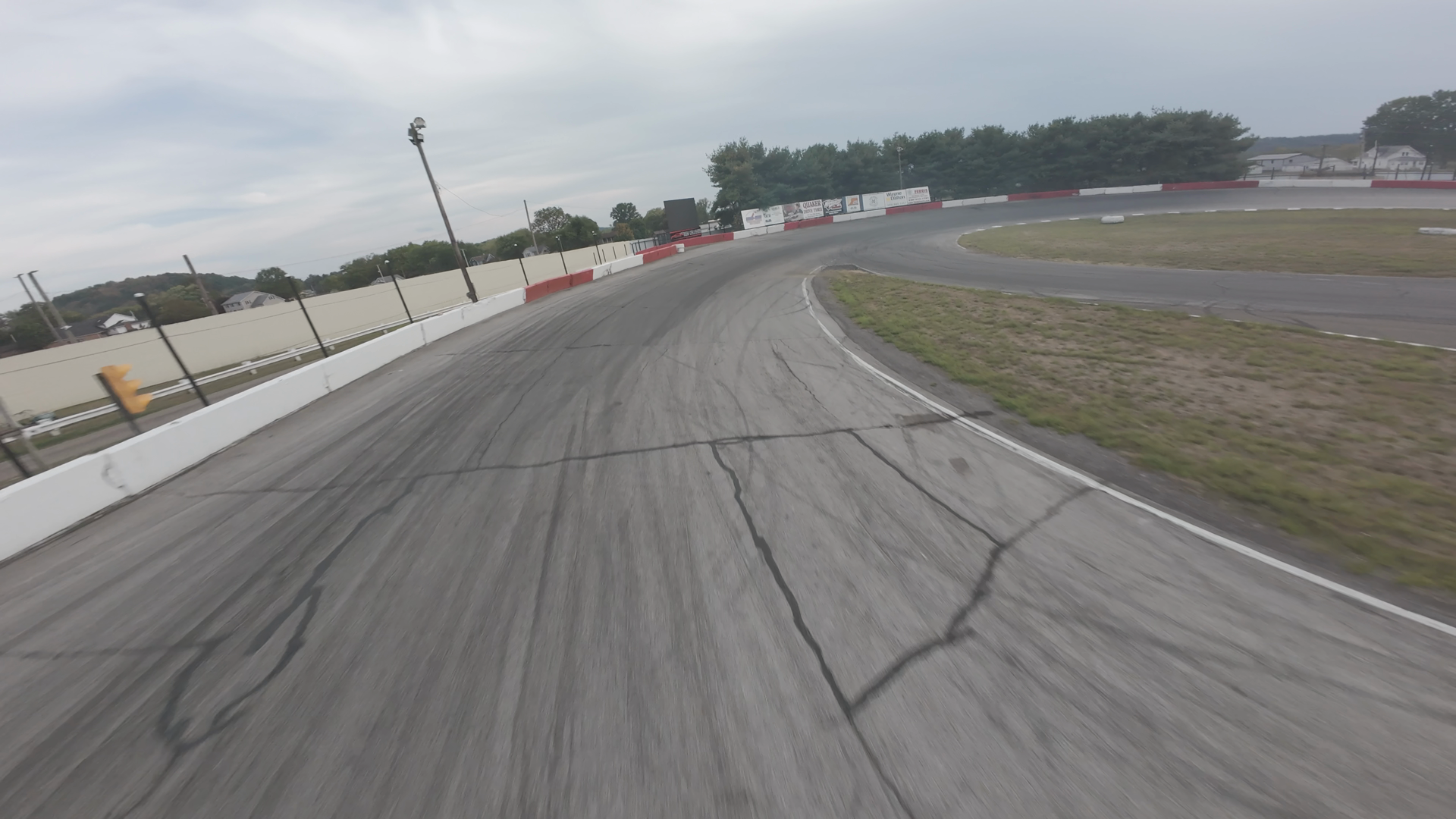 A wide view of a racetrack at Midvale Speedway on a cloudy day. The asphalt is smooth with visible tire marks, indicating previous use. Guardrails line the edge of the track, and there are small bollards placed around the perimeter. Advertisements can be seen on the backdrop walls at the end of the straightaway. The surrounding area is mostly open with some trees visible in the distance, and residential structures can be seen at the far end of the race track.