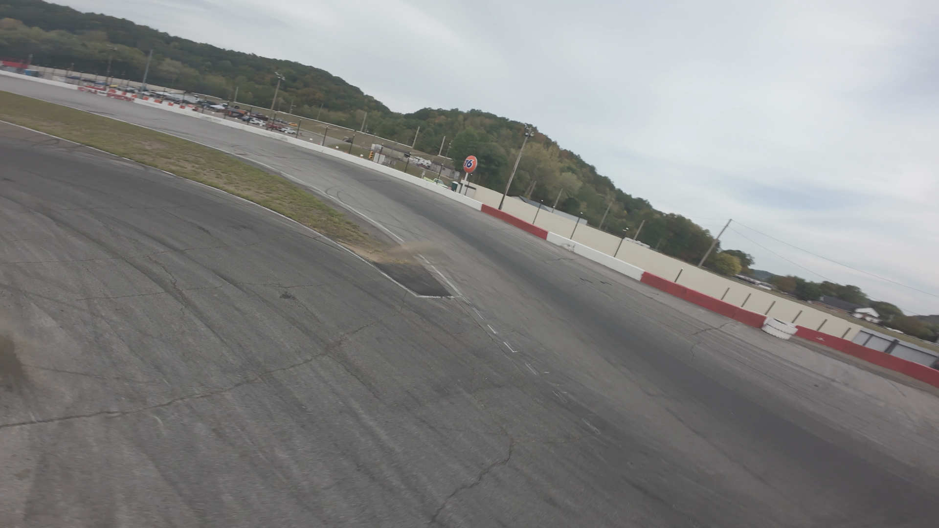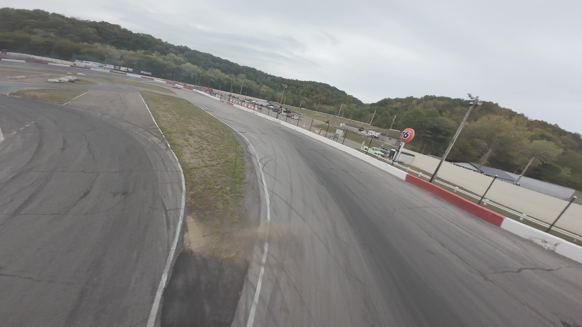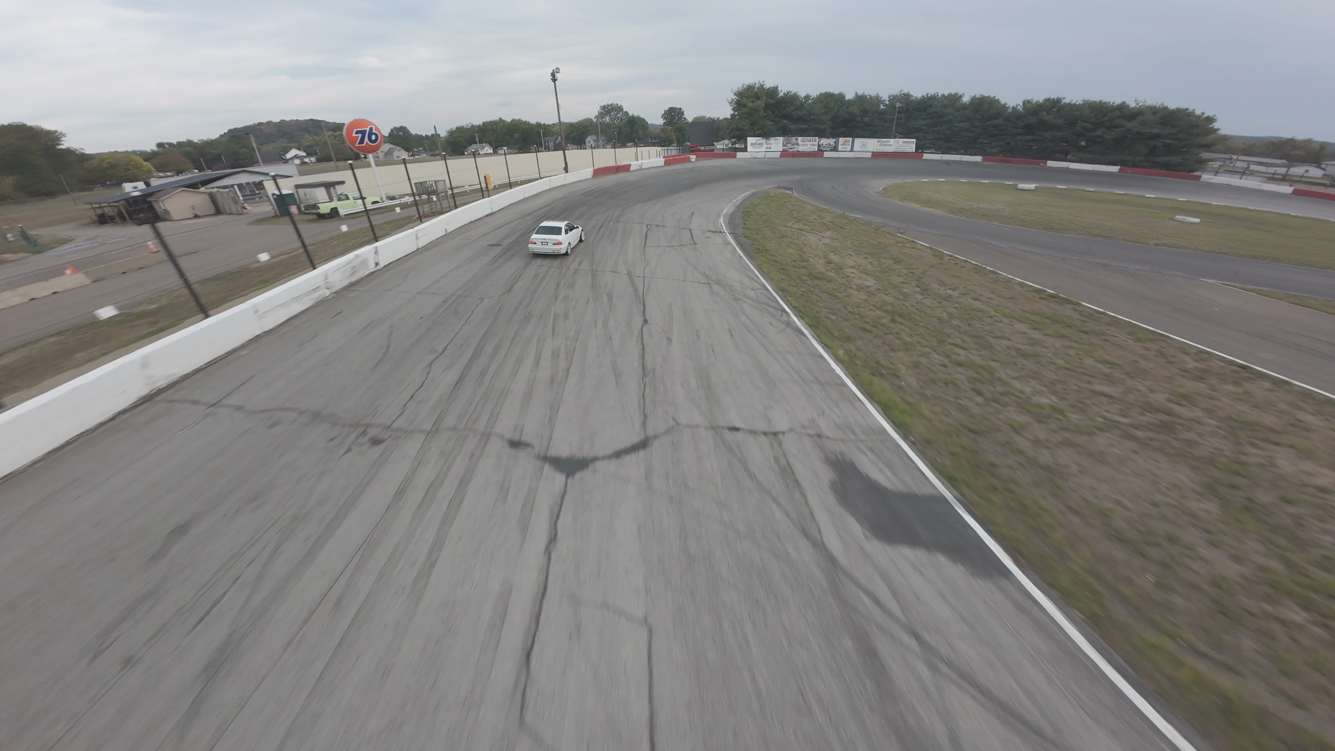 The video is captured from an FPV drone of a white car on the Midvale Speedway track. The car is moving along a straight section of the track, which is bounded by white barriers on one side and green grass on the other. The track surface appears worn, with visible tire marks. A 76 gas station sign is visible in the background, adding to the racetrack setting. The surroundings consist of a parking area, some greenery, and a clear sky, indicating a calm day.