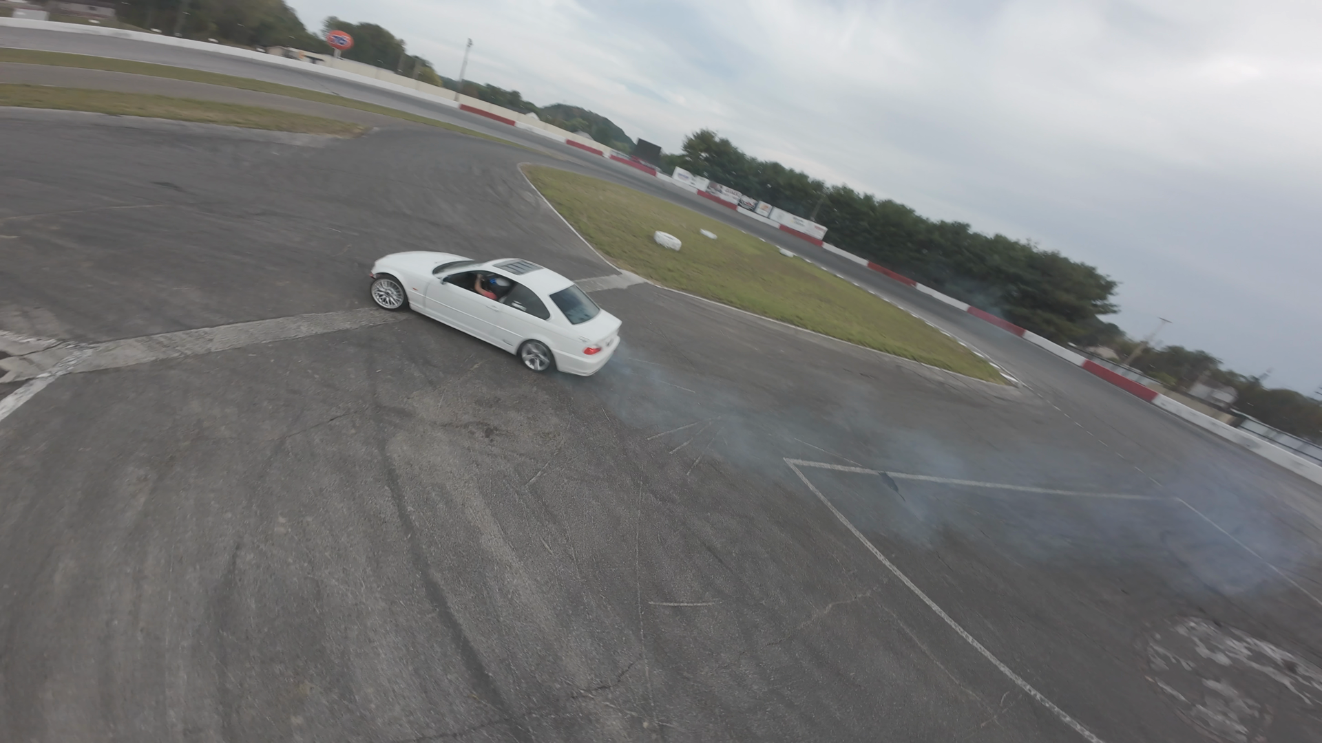 A white BMW 3 Series is captured in action during a drift session at Midvale Speedway. The car is emitting noticeable smoke from its rear tires as it maneuvers through a curve on the track. The driver's side door is ajar, and the car appears to be moving at a moderate speed. The track is bordered by a red and white barrier, with the environment showing overcast skies and a few trees in the background. The car's tires show signs of wear with deep grooves and slight damage. Overall, the scene conveys a sense of motion and control, reflective of a dynamic drifting experience.