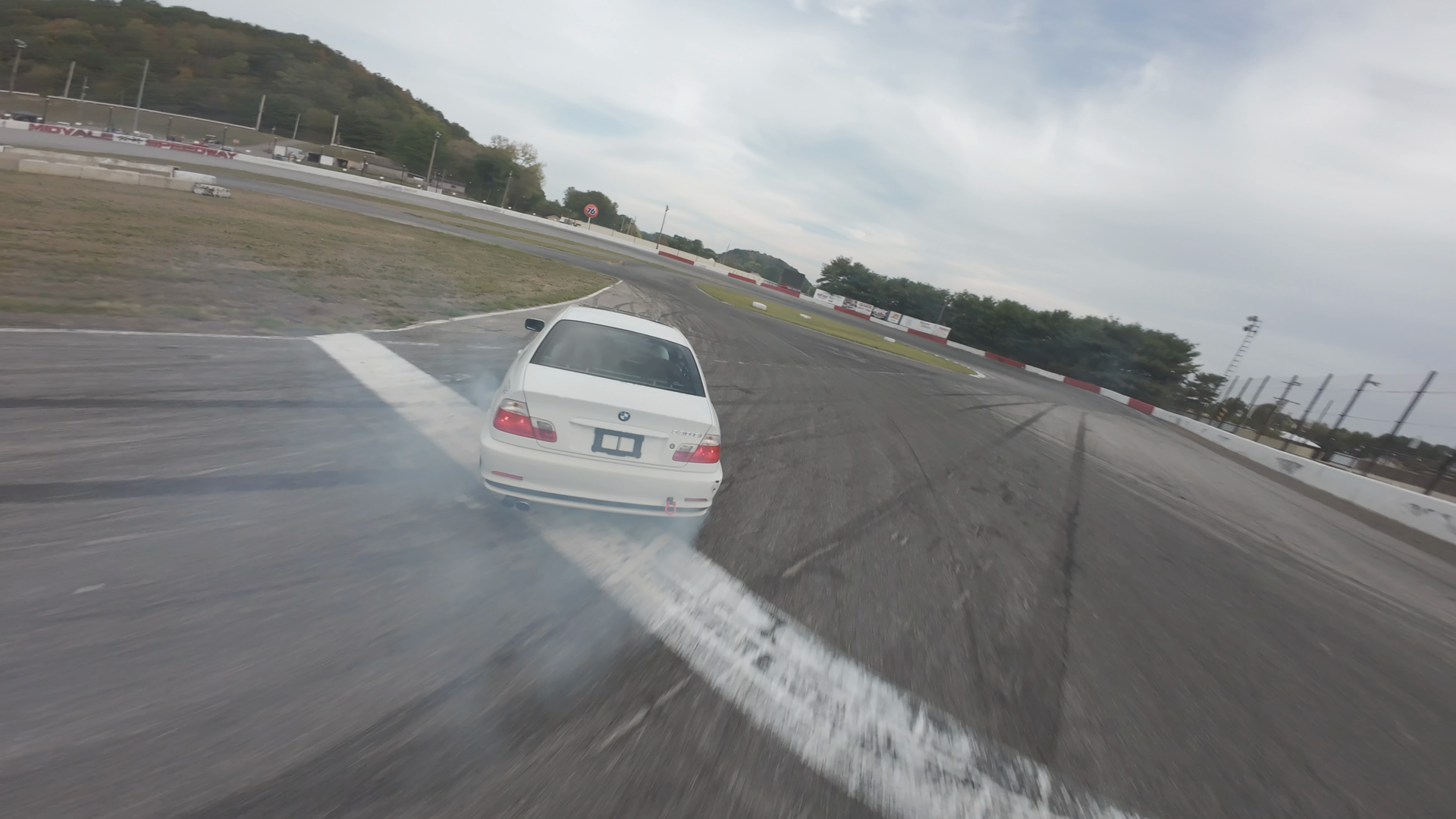 The video shows a white BMW drifting on a racetrack at Midvale Speedway. The car is mid-turn on a banked section with a visible skid mark and a haze of smoke from the tires. The driver, wearing casual attire, leans forward, gripping the steering wheel tightly as the car leans into a drift. The sky is overcast, giving the scene a gloomy atmosphere. The track is surrounded by trees and barriers, emphasizing a competitive and dramatic driving experience.
