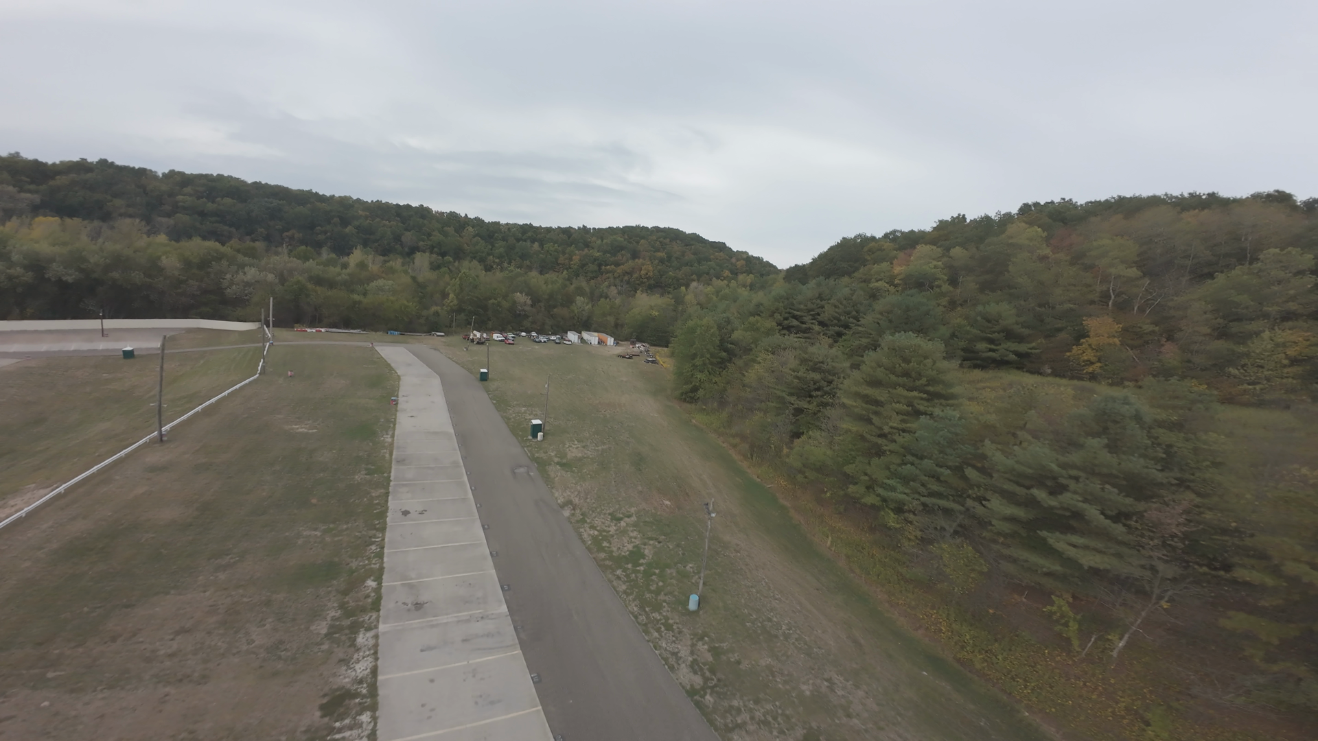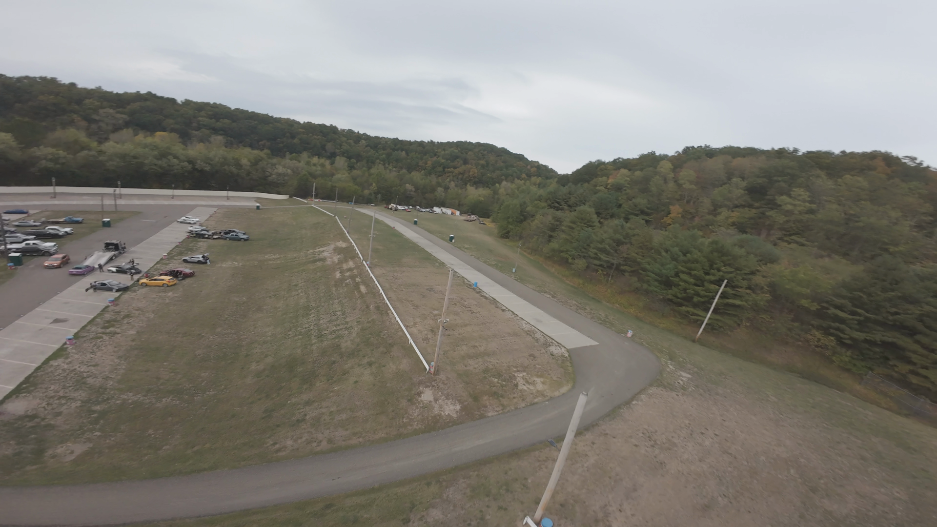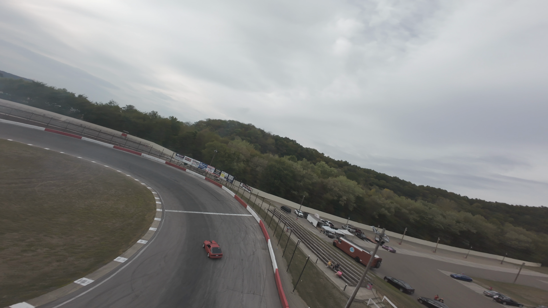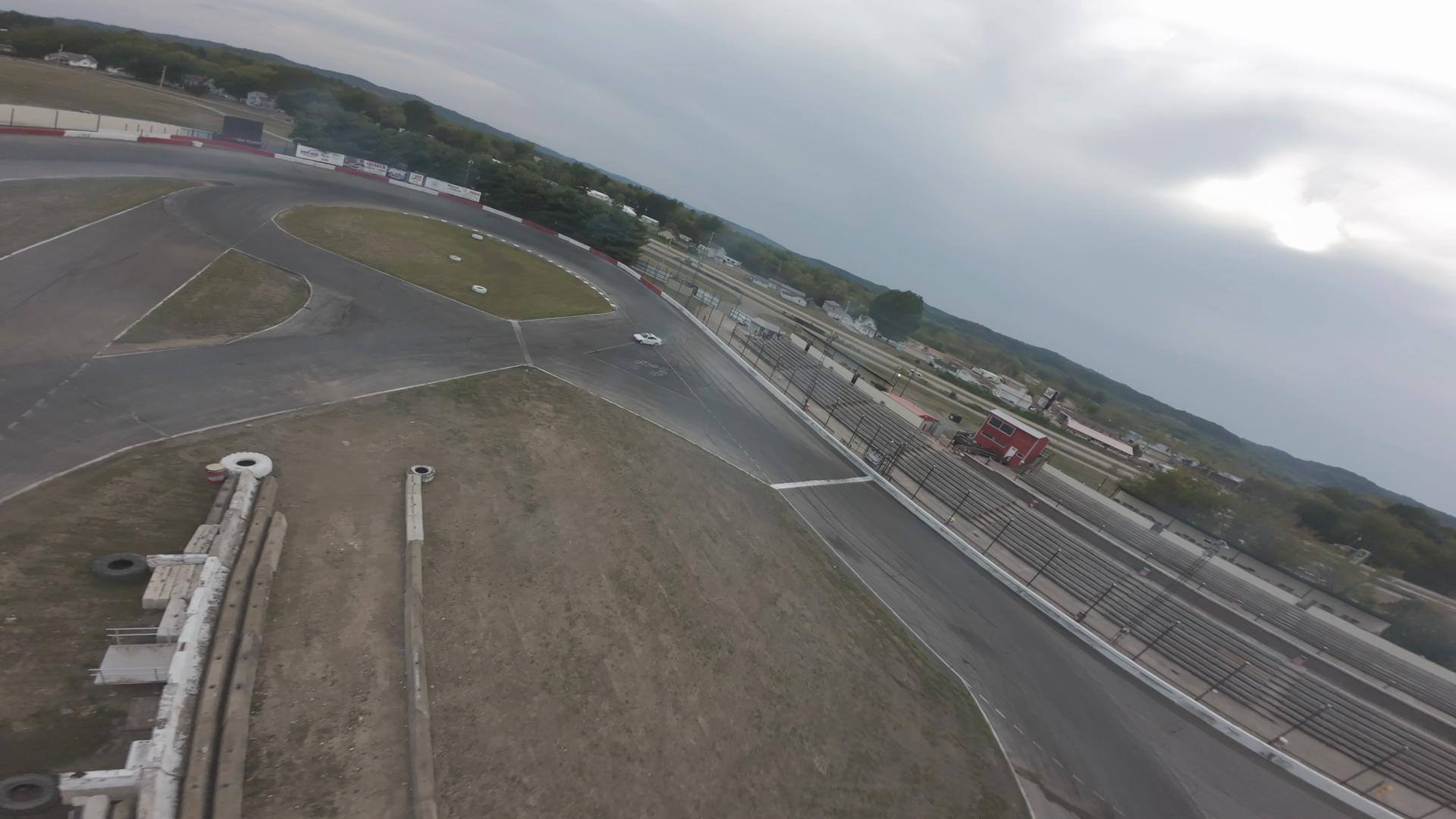An aerial view from an FPV drone captures a racetrack at Midvale Speedway. The empty grandstands and the smooth asphalt surface are prominent, suggesting a non-event day or early morning. The track curves gently with a grassy infield between sections of the track. A small white car is visible in the distance, seemingly test-driving the track as part of the preparation or event setup. The sky is overcast, diffusing natural light, providing a neutral tone to the scene.