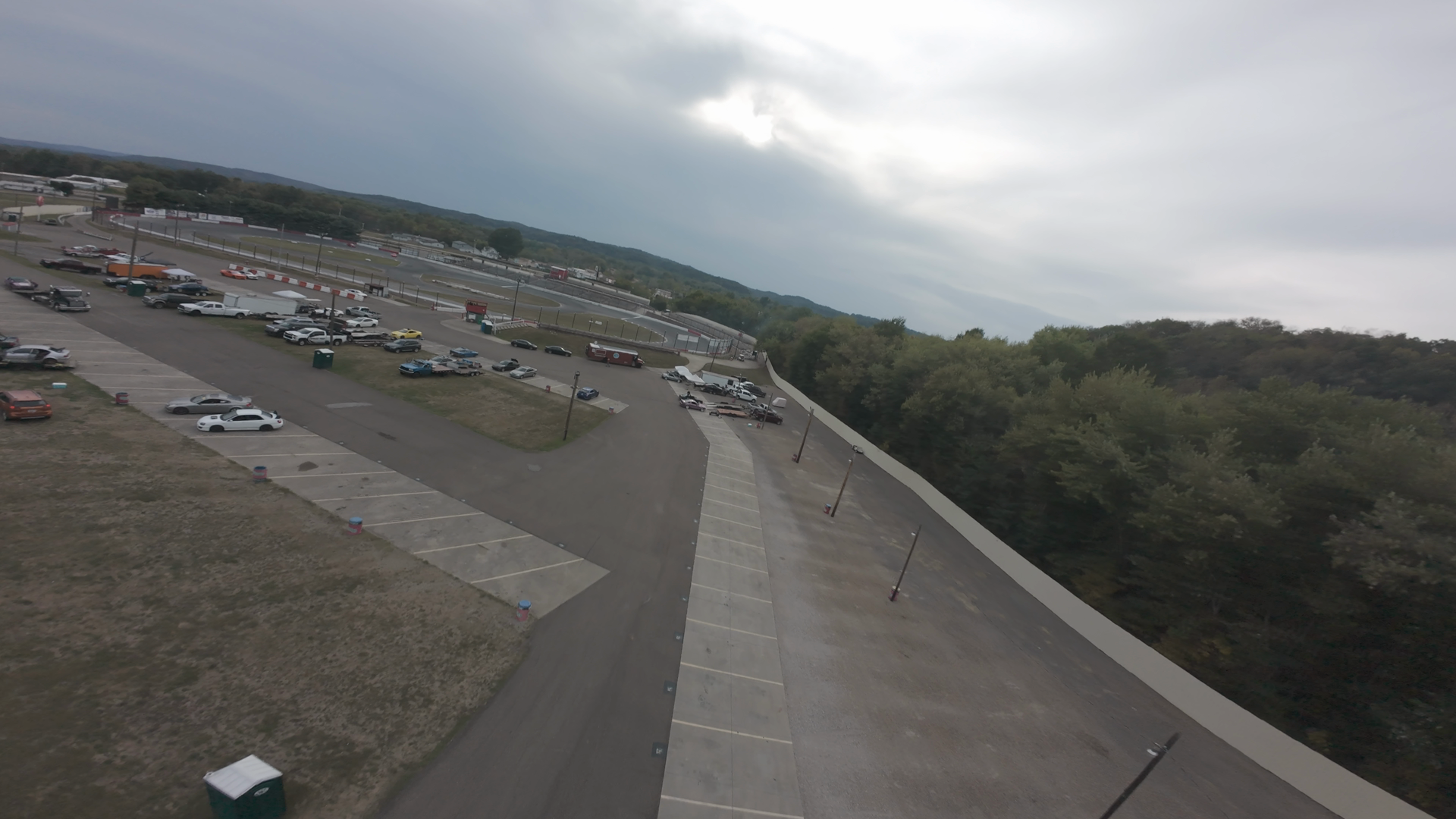 The image shows a wide aerial view of Midvale Speedway, showcasing the track, parking lot, and surrounding area. Several cars are parked in the lot, and the track curves through the landscape. The area is surrounded by dense trees, and the sky is overcast. The scene captures a calm pre-drift atmosphere with no visible activity on the track or in the parking area.
