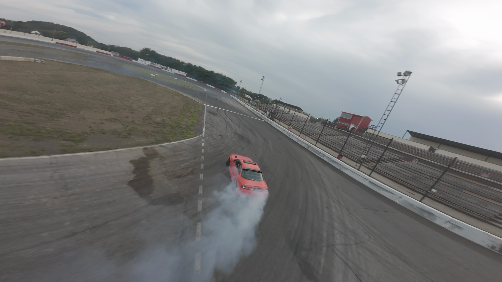 A red car is captured drifting on a banking section of the Midvale Speedway track on a cloudy day. The car leaves a trail of smoke, indicating the tires are generating a significant amount of heat due to the friction. The track surface is wet, creating visible skid marks. The scene is devoid of spectators, suggesting the focus is solely on the driver and vehicle capabilities. The structure of the track, with a long stand and fencing, is characteristic of the Midvale Speedway, known for its family-friendly environment and excitement-filled events. The image conveys a dynamic and powerful moment, capturing the thrill of drifting on a high-speed turn.