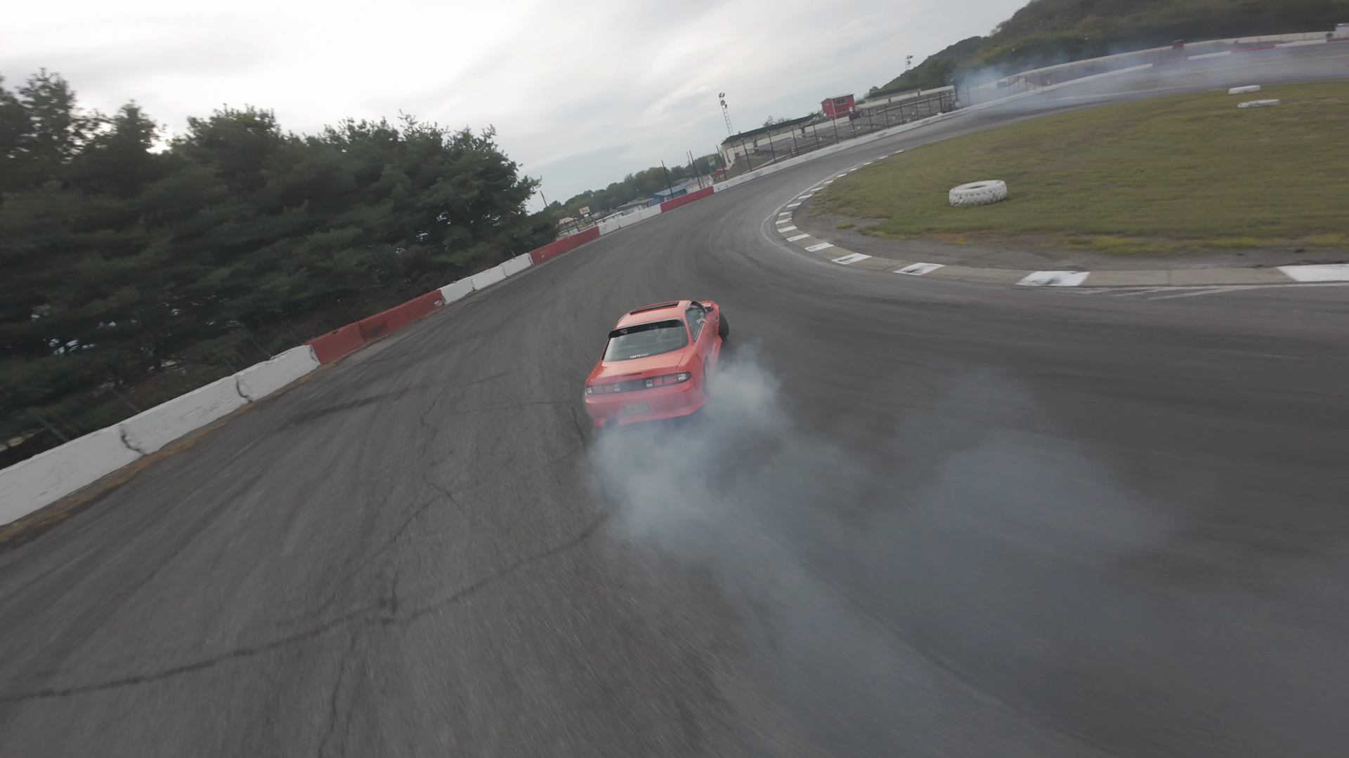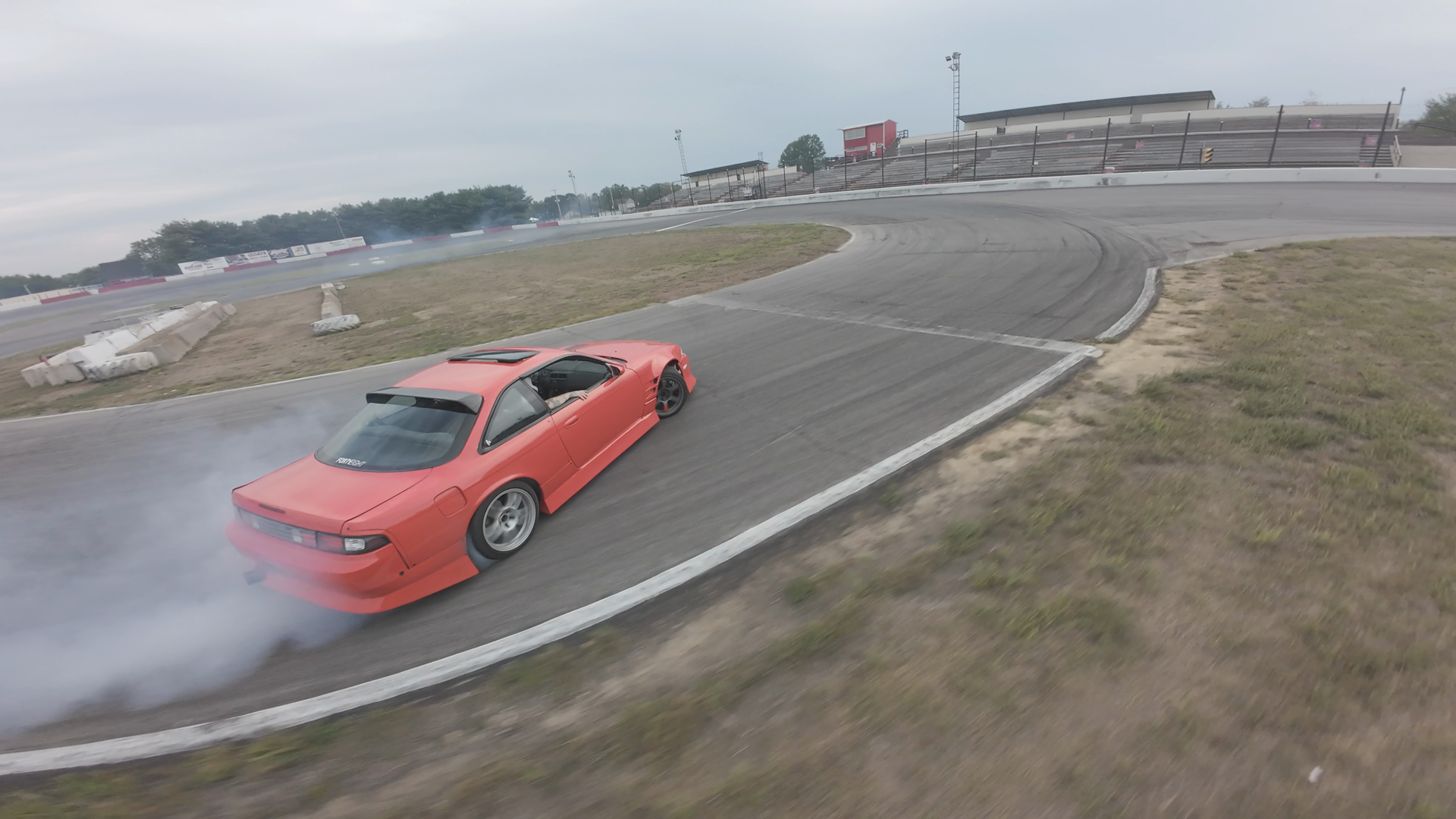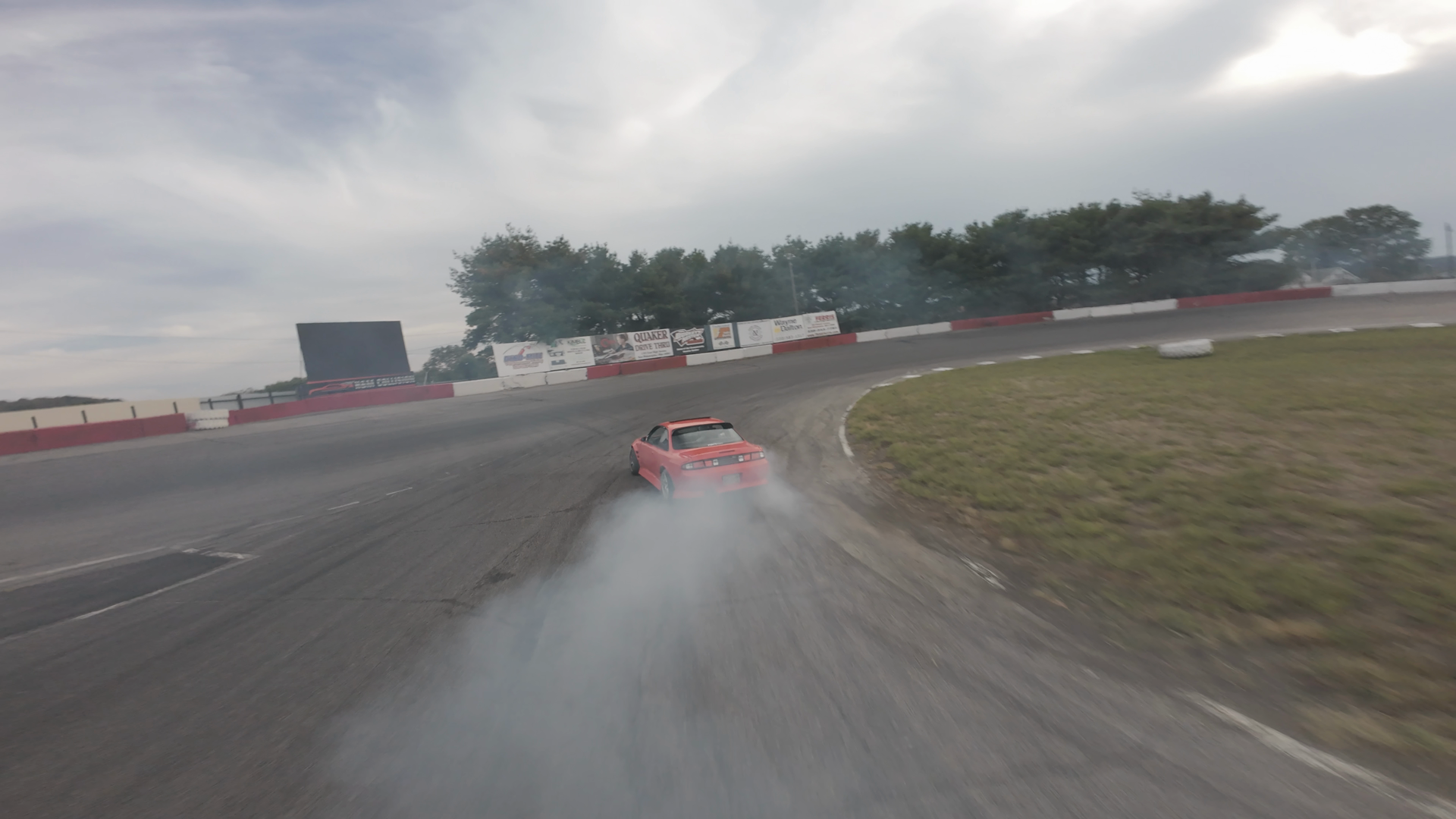 A vibrant orange Nissan S14 drifts dramatically on the Midvale Speedway's asphalt track, emitting significant smoke from worn tires. The car curves tightly into a corner, showcasing skilled control as it leans into the curve, sending a thick cloud of tire smoke behind it. The grass is well-groomed and neatly located along the edge of the track, with a series of sponsor banners visible in the background, adding to the race day ambiance. The cloudy sky above creates a dynamic, high-action scene.
