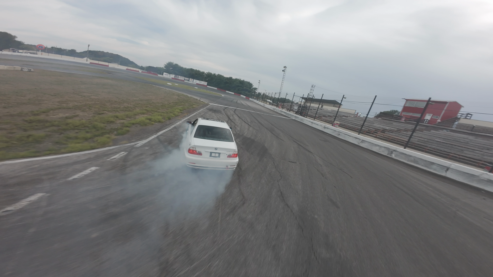 A white BMW is captured mid-drift on the right side of the Midvale Speedway track, with visible tire smoke indicating high speed and aggressive cornering. The car, a model that appears to be an E90 sedan, is positioned close to the curb, with the driver's side wheels scuffing the track surface, creating a trail of smoke. The vehicle is surrounded by the open raceway and visible trackside fencing, along with a distant red building and sparse trees in the background. The car’s headlights and taillights are illuminated, emphasizing its dynamic motion. The sky is overcast, suggesting a cloudy day.