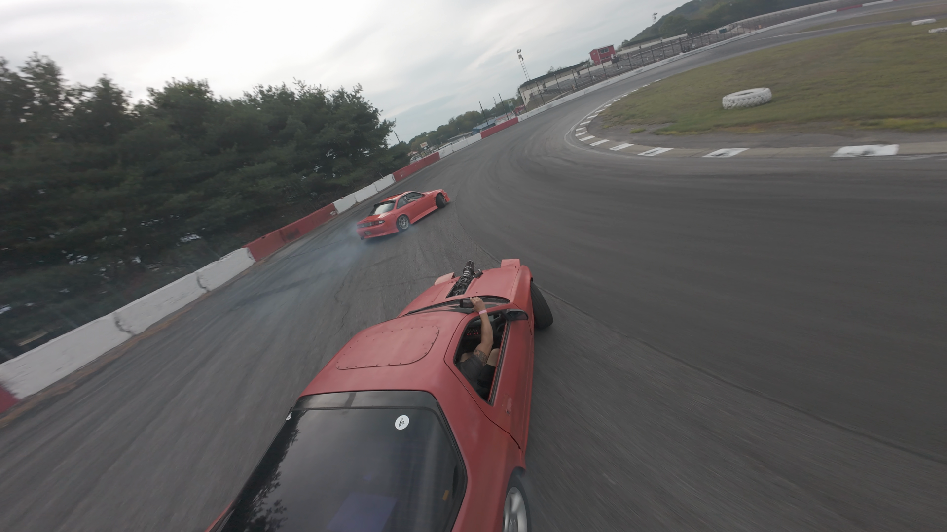 A red sports car is seen performing a drift at a racing track. The car, with its tires smoking, is leaning into a turn, showcasing its speed and control through the curve. The track is surrounded by red and white safety barriers, and the scene is set on a cloudy day, with a hint of greenery in the background. The car's tires are creating noticeable smoke, and the driver appears to be focused on maintaining control of the vehicle. The tires' condition suggests wear, indicating frequent use in drifting sessions.