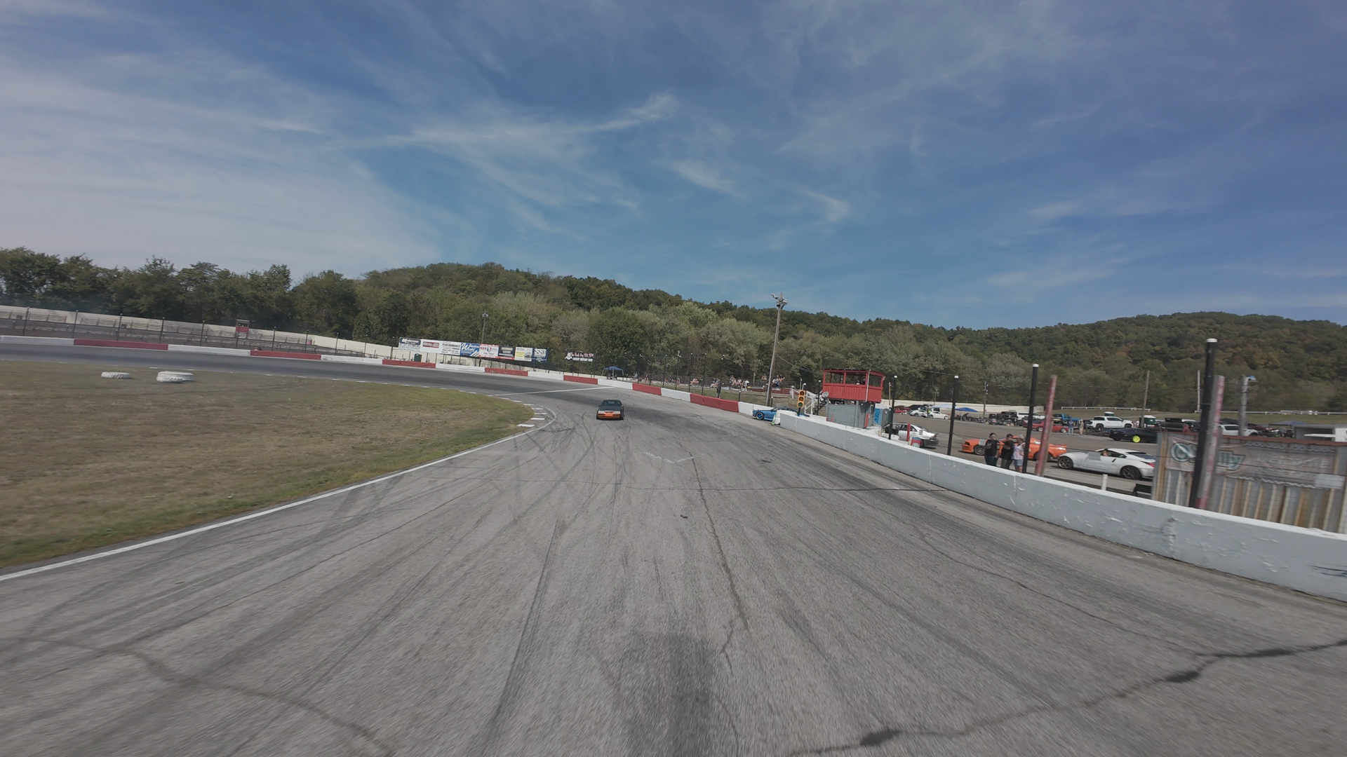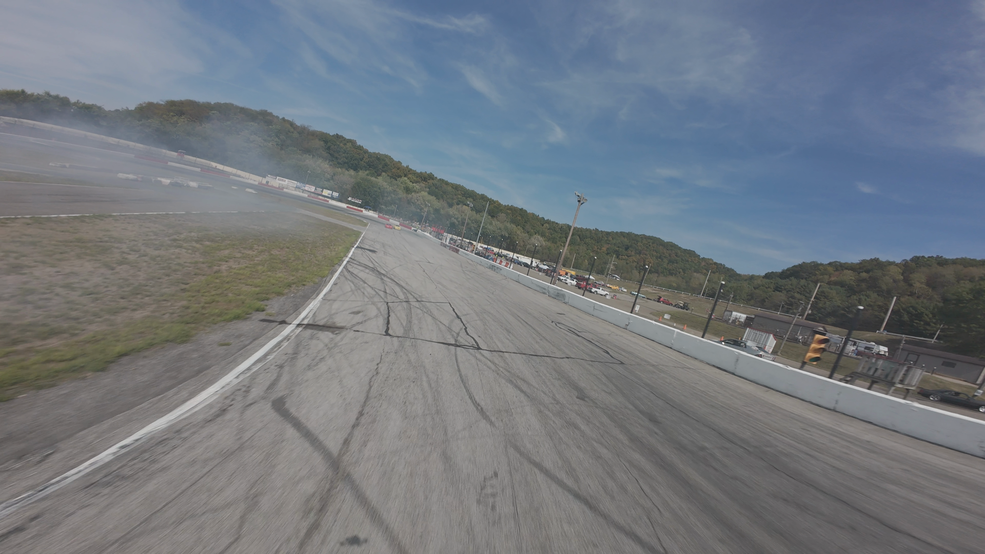 The image shows a straight section of the Midvale Speedway track with skid marks and tire smudging along the asphalt. The camera is positioned at street level, capturing a wide view of the track bordered by concrete barriers. In the background, a forested area rises, and on the right, there are some buildings and trailers near the track, indicating an active event or practice session. The sky is clear with some scattered clouds, suggesting favorable weather. The track appears well-used, reflecting the intensity of racing activities.