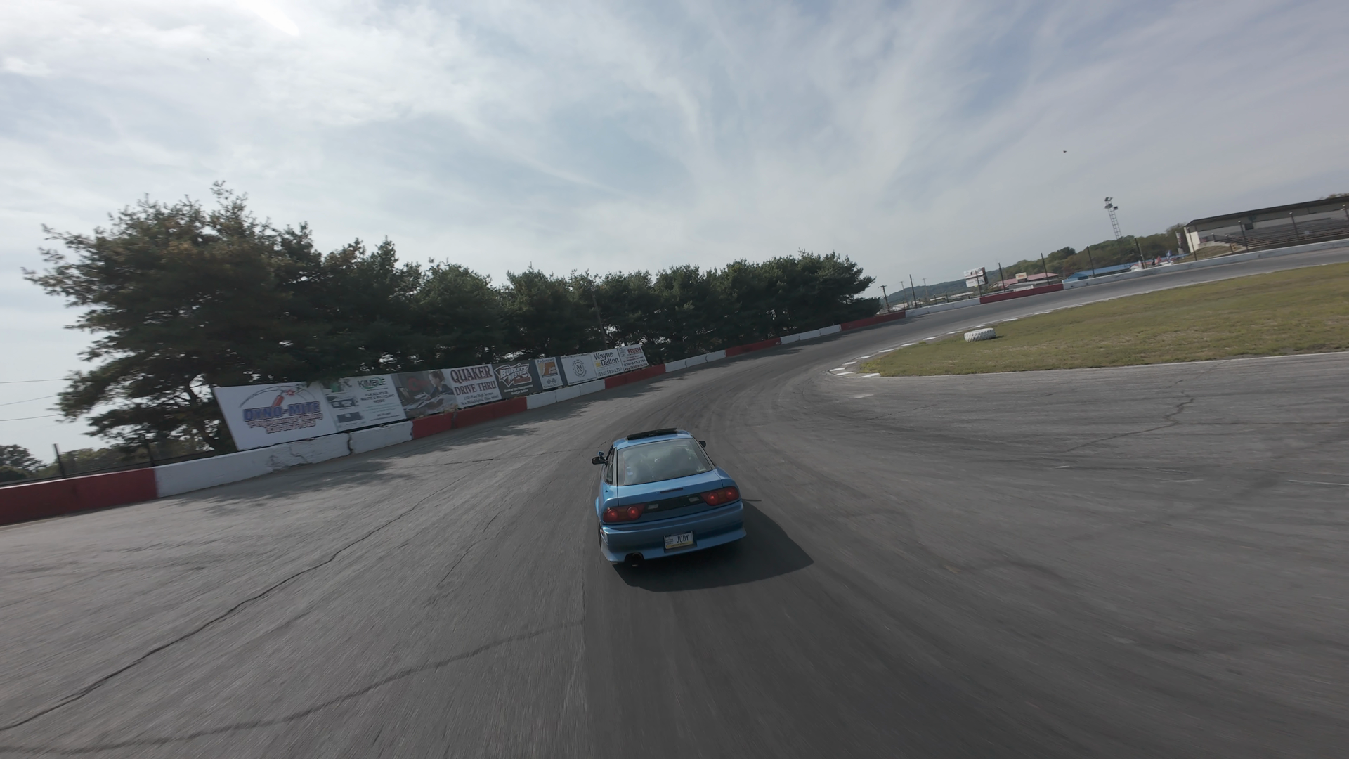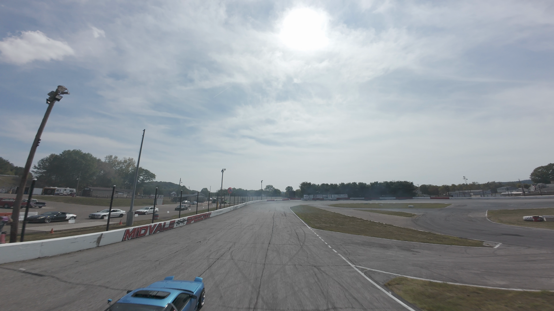 The image depicts a wide, clear view of the Midvale Speedway track on a sunny day. The asphalt surface shows tire marks from racing, and the track is bordered by white barriers and black safety fencing. Trees line the perimeter of the track, and several vehicles are parked or moving around the edge. The sky is mostly clear with scattered clouds. The area is bordered by open fields and some low buildings in the background. A blue car is stationary at the bottom left, and some individuals can be seen near the track perimeter. The overall scene appears calm with no ongoing racing activity visible.