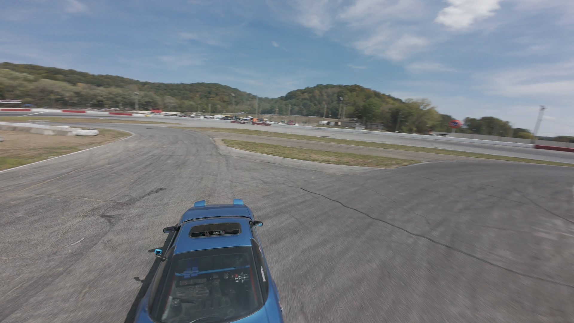 A blue racing car is captured navigating a curved section of the Midvale Speedway track. The vehicle is in motion, indicating a practice run or race event. The track surface appears worn with visible tire marks. In the background, hills with dense green foliage are visible under a partly cloudy sky. The environment suggests a calm day with suitable conditions for racing activities. There is no visible driver detail in this frame, as the focus is on the vehicle and the environment.