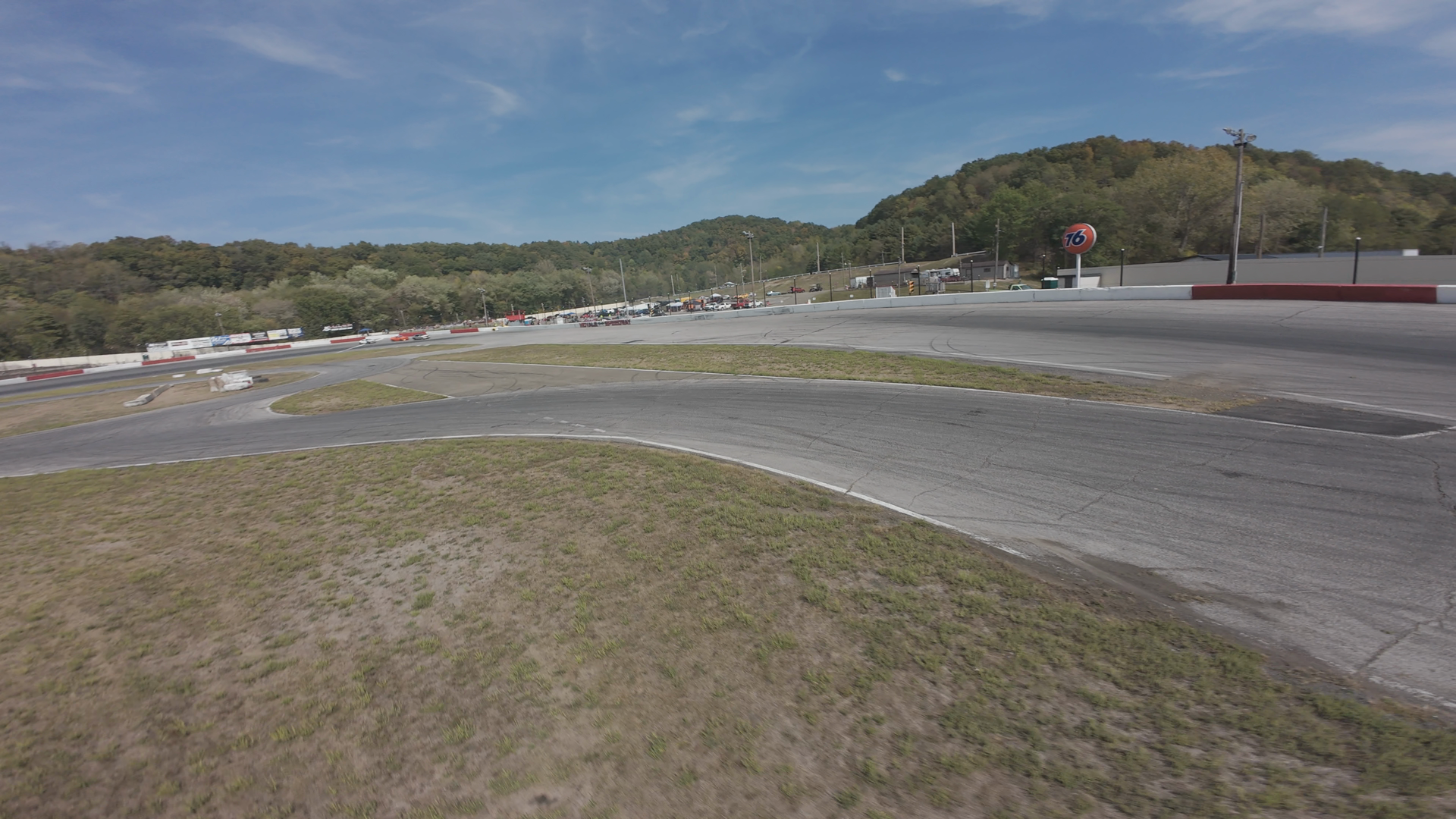 An aerial view of Midvale Speedway, displaying a wide, paved track with a gently banked corner and a grassy area in the foreground. The track is surrounded by a low fence, with trees and hills visible in the background. There are no visible cars or drivers in the image, suggesting a scene of preparation or a moment of stillness before a drift event.