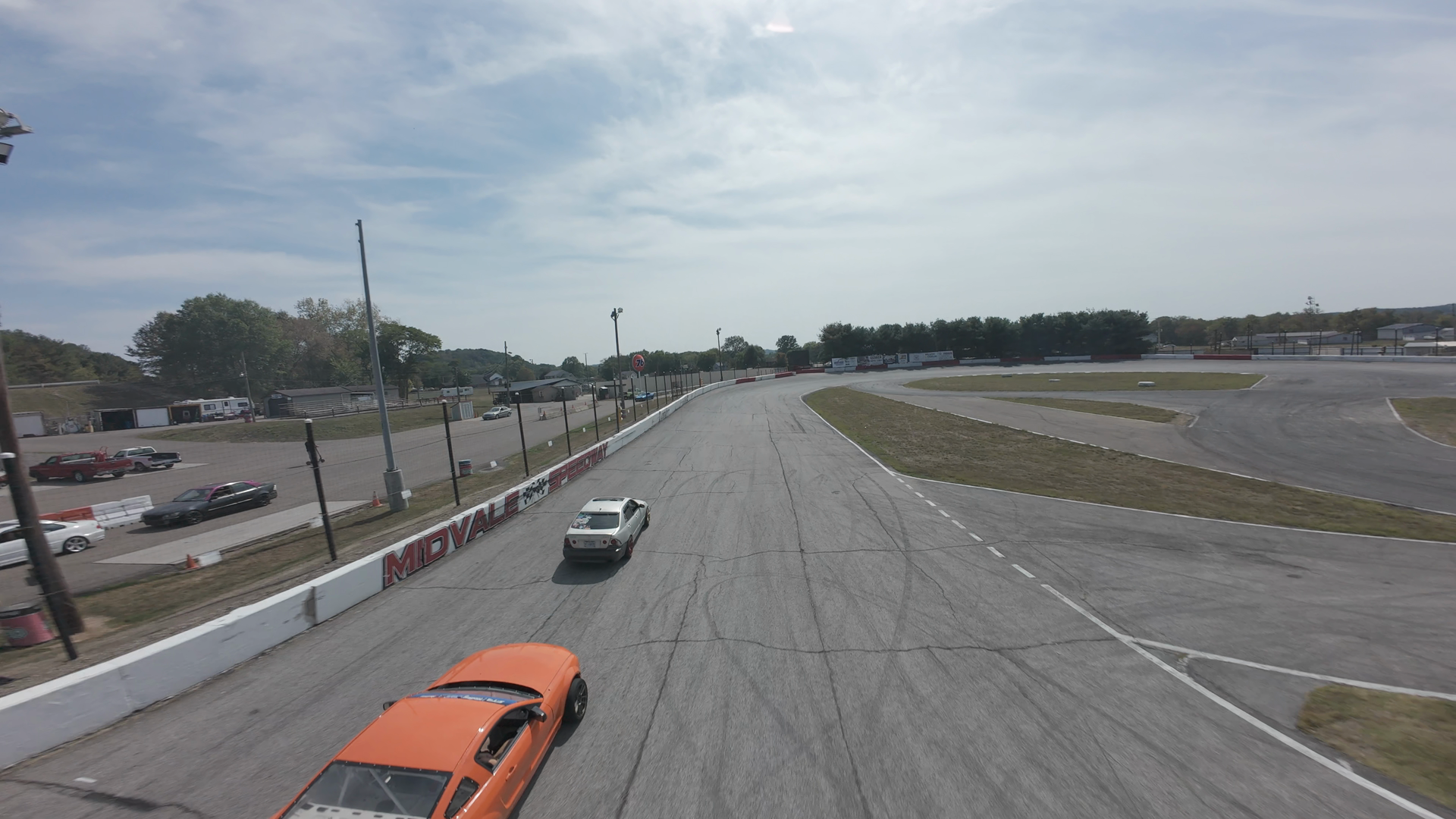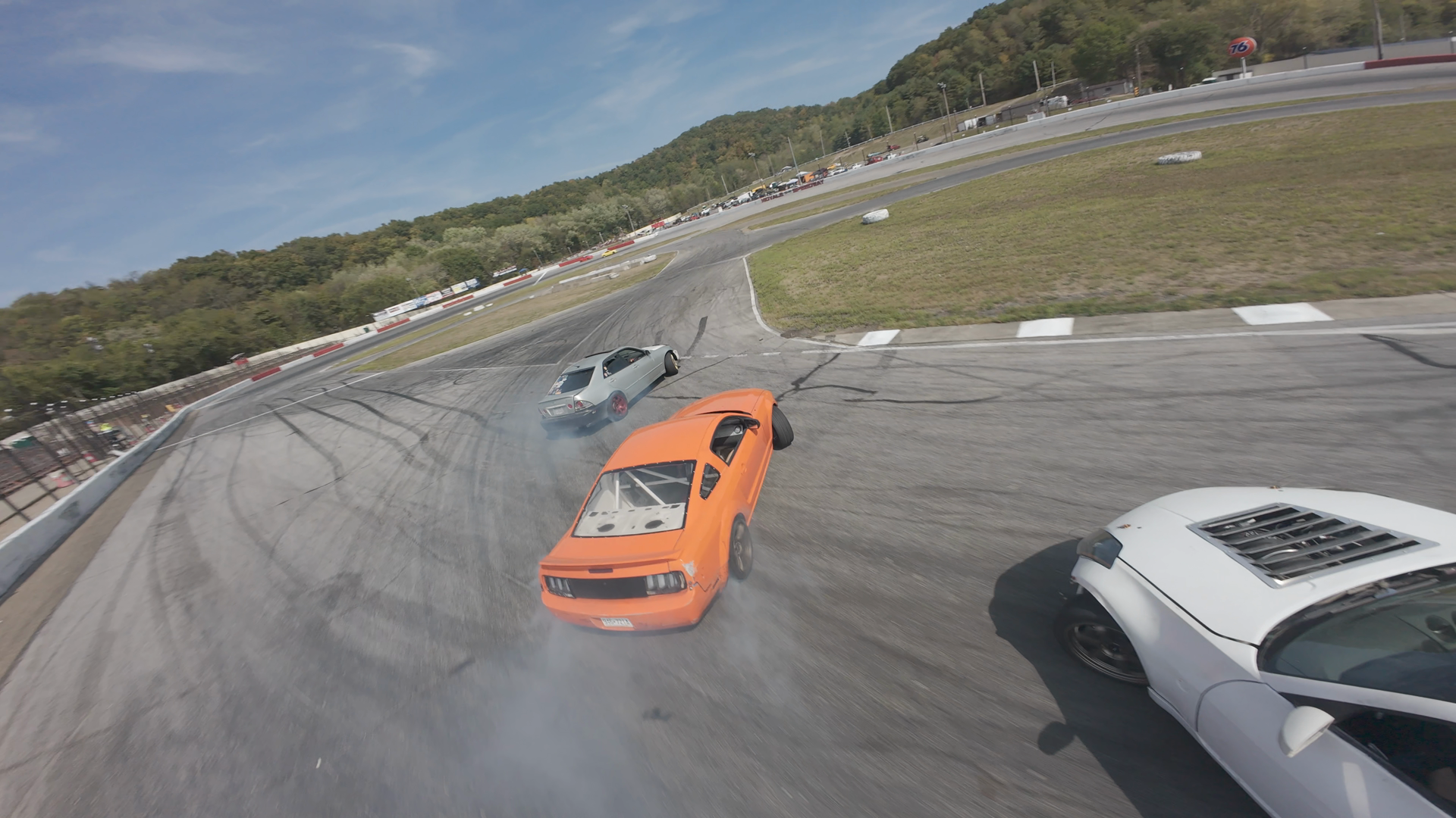 The image captures two cars engaged in drift racing on a race track at Midvale Speedway. The orange car is in the foreground, executing a drift with noticeable tire smoke, while behind it is a white car following a similar maneuver. Both cars are airborne as they navigate a turn, showcasing their dynamic movement and speed. The race track is surrounded by a grassy area and hills, indicating an outdoor venue. The clear sky and bright sunlight suggest a pleasant day for racing. No branding or logos are visible on the cars in this frame.