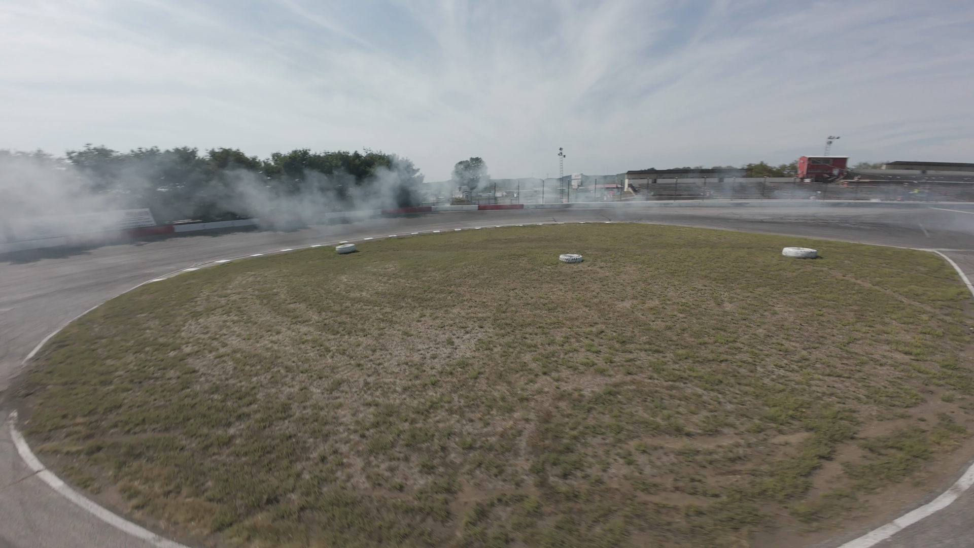 The image shows an expansive view of a circular grassy area located within Midvale Speedway. The area appears to be a dedicated drifting or racing spot, marked out by white boundaries and dividers. The surrounding track is visible with white lines along the edge, and smoke from recent drifting can be seen in the foreground. The scene suggests a racing event or practice session is taking place, with no vehicles or people visible in the frame.