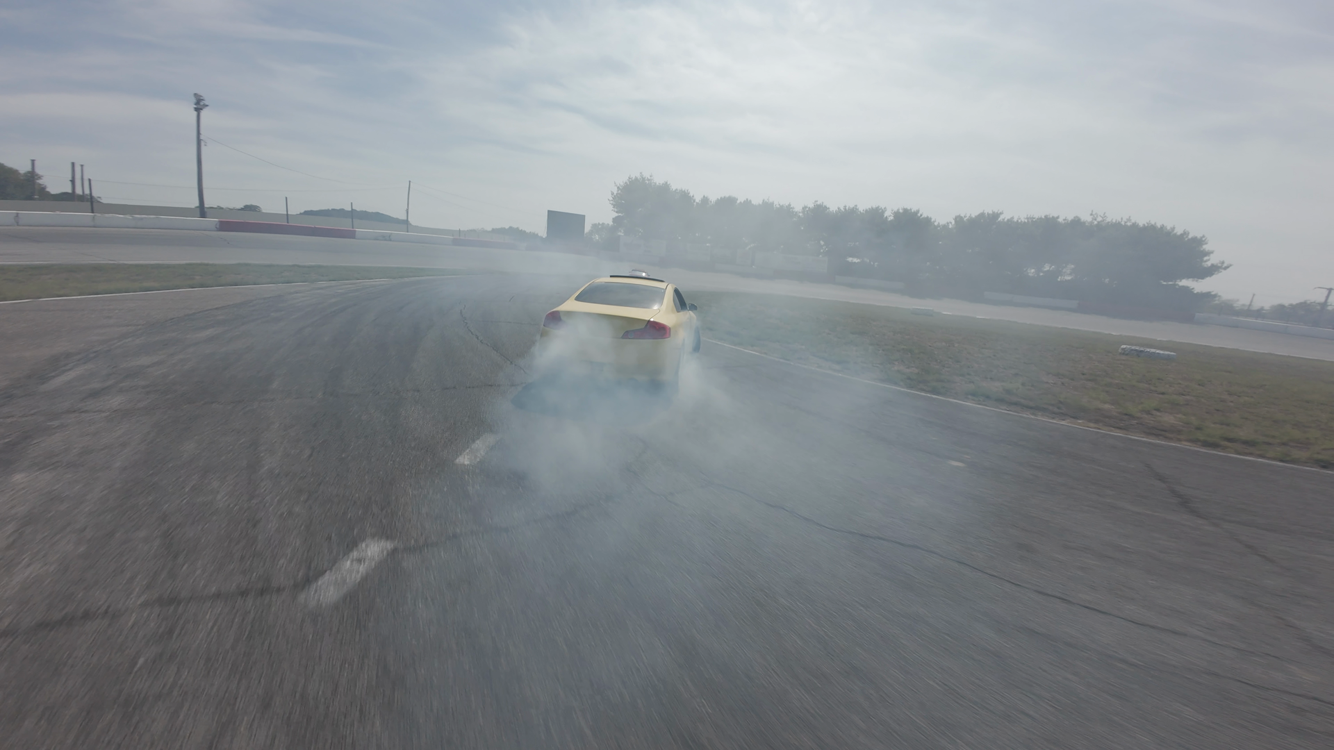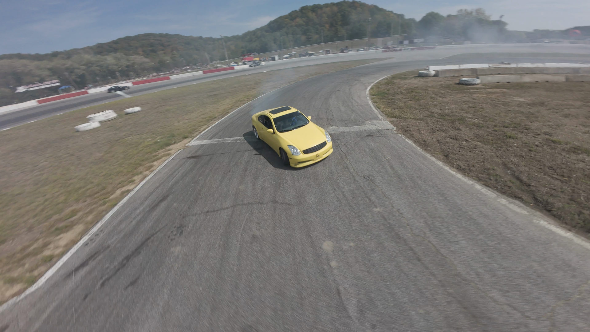 A yellow Infiniti G35 is captured from an aerial view as it navigates a corner on a race track. The car is slightly elevated, showcasing its tires in mid-turn, with smoke emanating from the tiresindicating a drift. The track is bordered by tire barriers and grassy areas, with a backdrop of hills and some track infrastructure visible in the distance. The vehicle appears to be in good condition, and the scene is dynamic, with the smoke adding a dramatic effect to the action. The excitement level is moderate due to the smoke and cornering.