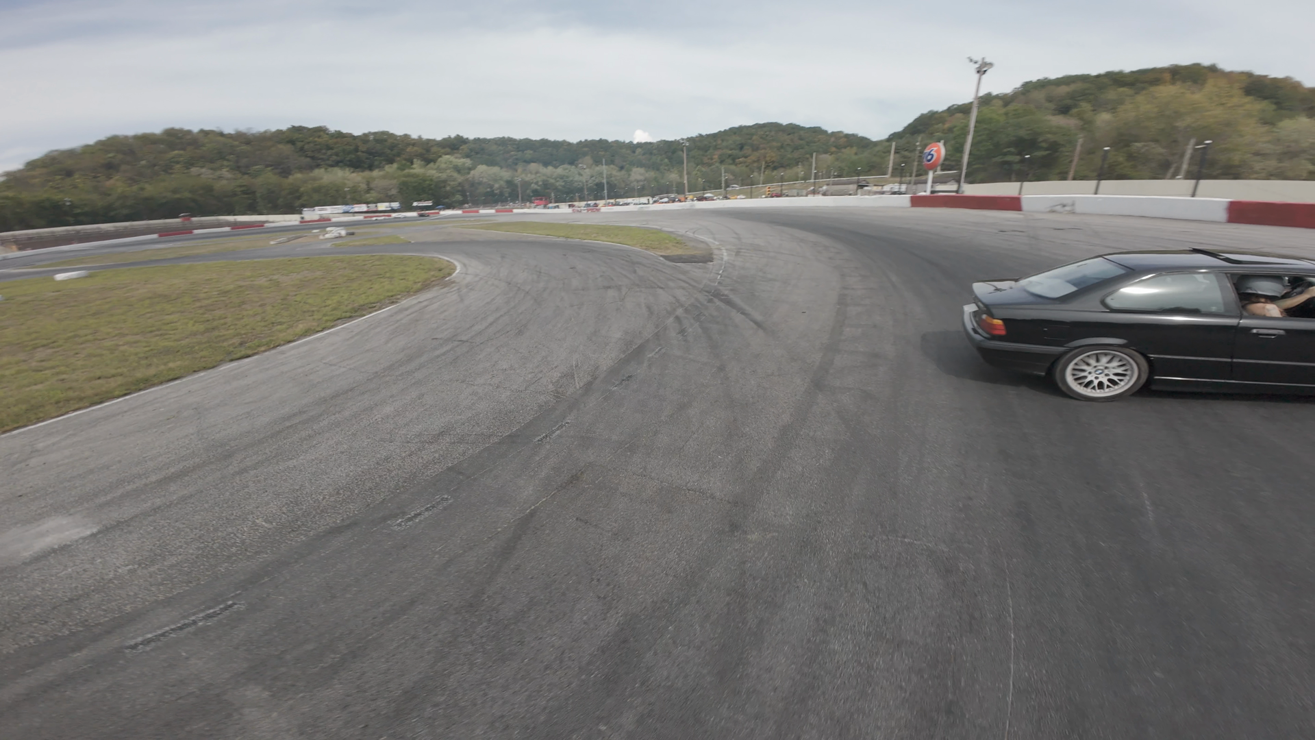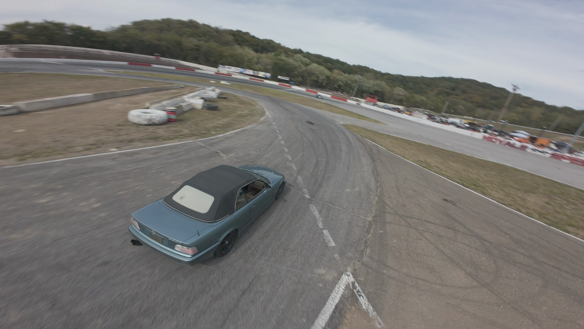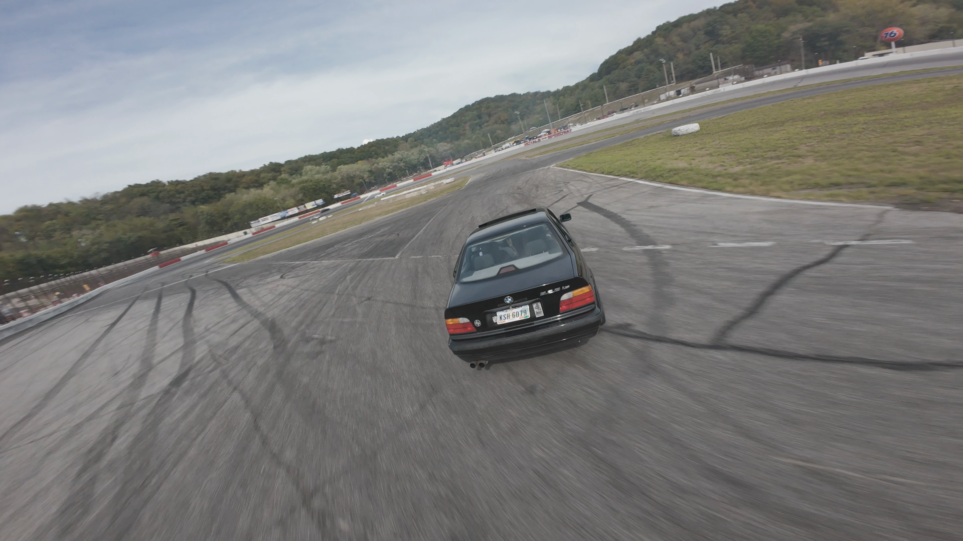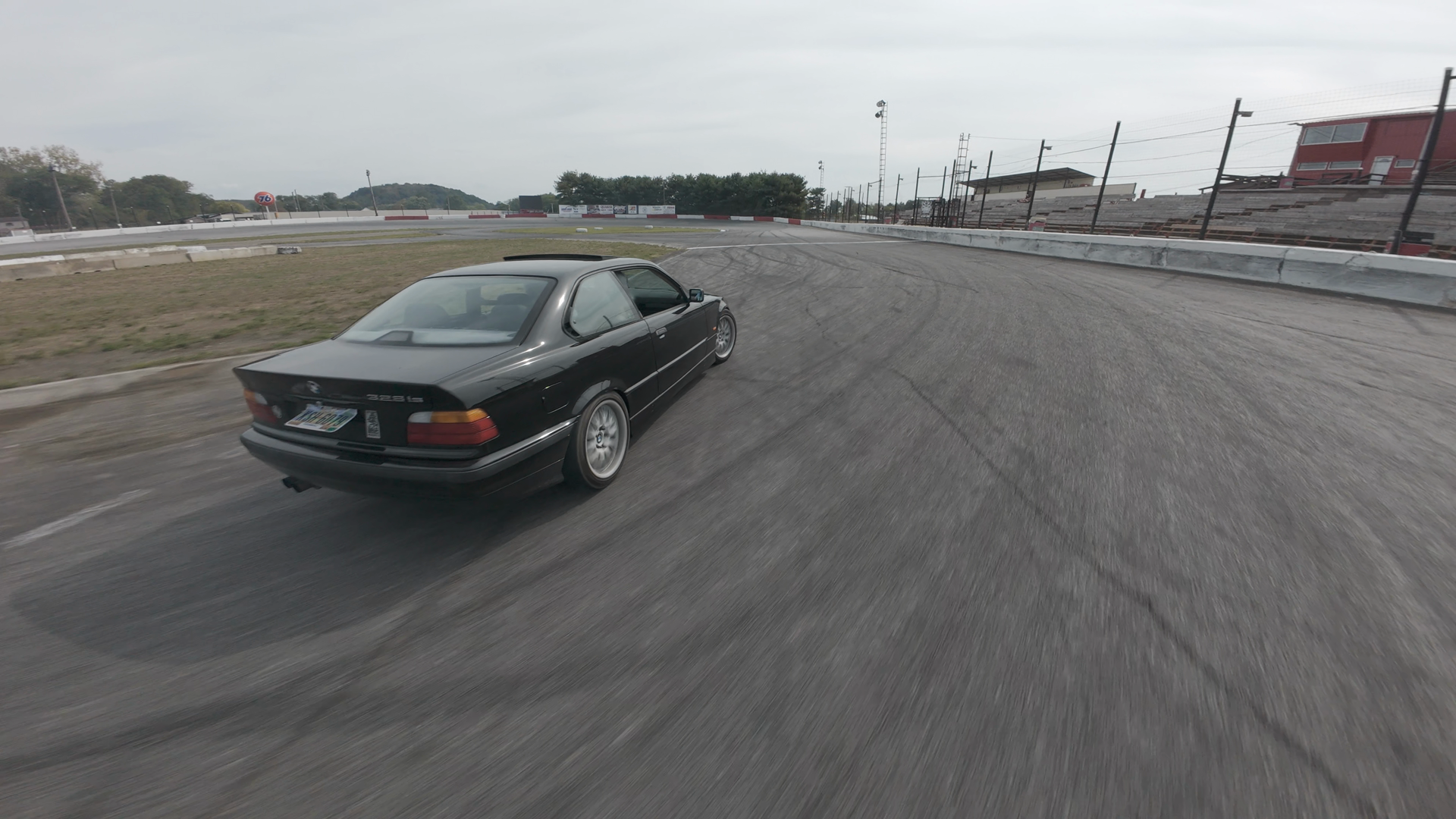 A black BMW M3 is captured from an FPV drone, speeding along the straightaway of a racetrack at Midvale Speedway. The car, a classic model with a dark finish, is seen mid-turn, showcasing its tires gripping the asphalt as it navigates the curve. The driver, obscured by the car's body, appears focused. The racetrack is wide with visible tire marks on the asphalt, and the surroundings feature greenery and distant hills under an overcast sky. The scene exudes a sense of motion and speed, typical of a professional racing event.