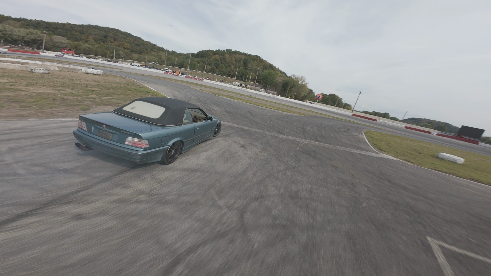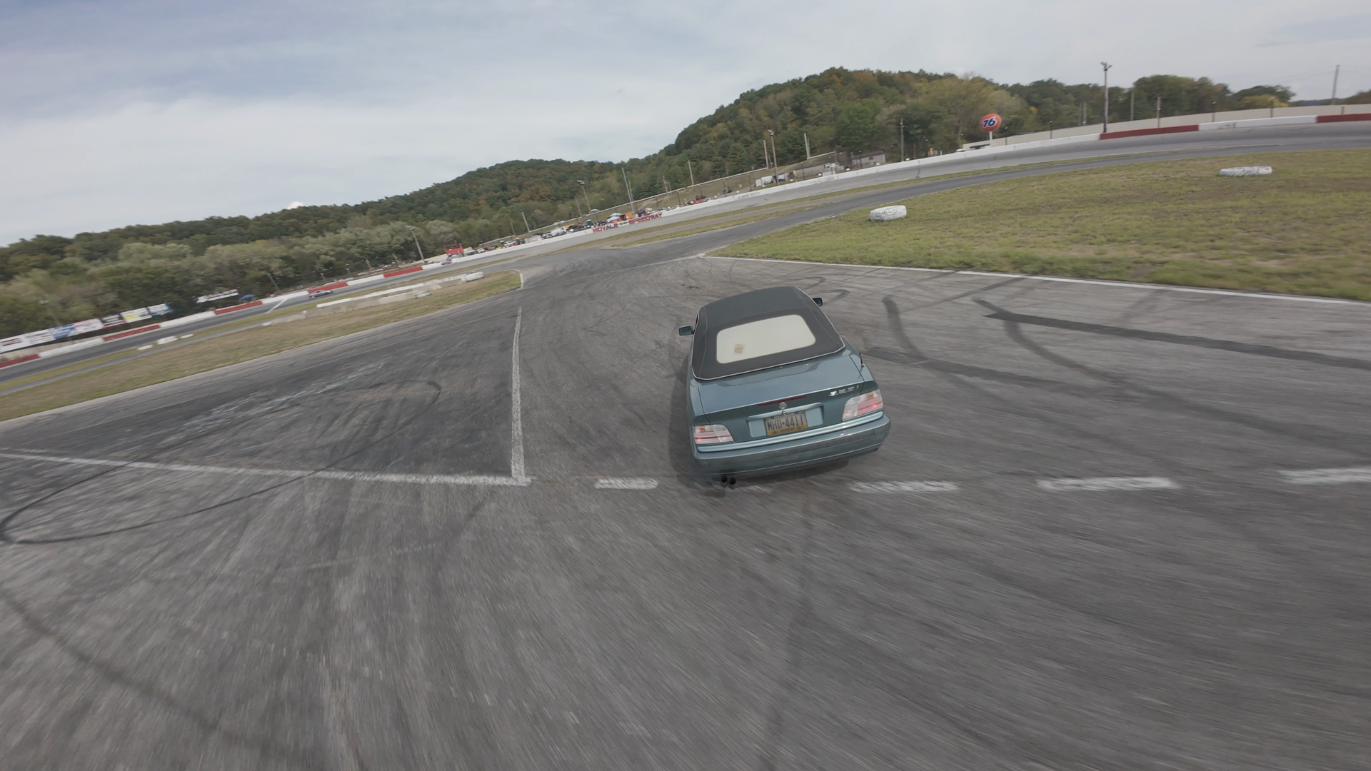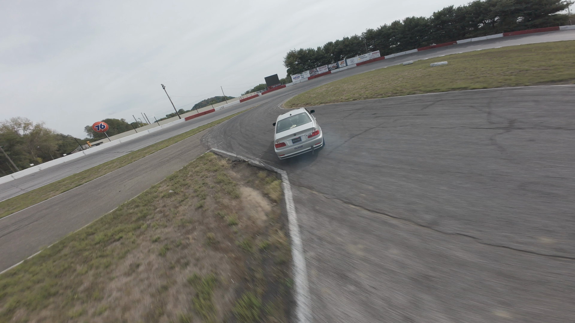 A black BMW M3 is captured from an FPV drone, speeding along the straightaway of a racetrack at Midvale Speedway. The car, a classic model with a dark finish, is seen mid-turn, showcasing its tires gripping the asphalt as it navigates the curve. The driver, obscured by the car's body, appears focused. The racetrack is wide with visible tire marks on the asphalt, and the surroundings feature greenery and distant hills under an overcast sky. The scene exudes a sense of motion and speed, typical of a professional racing event.