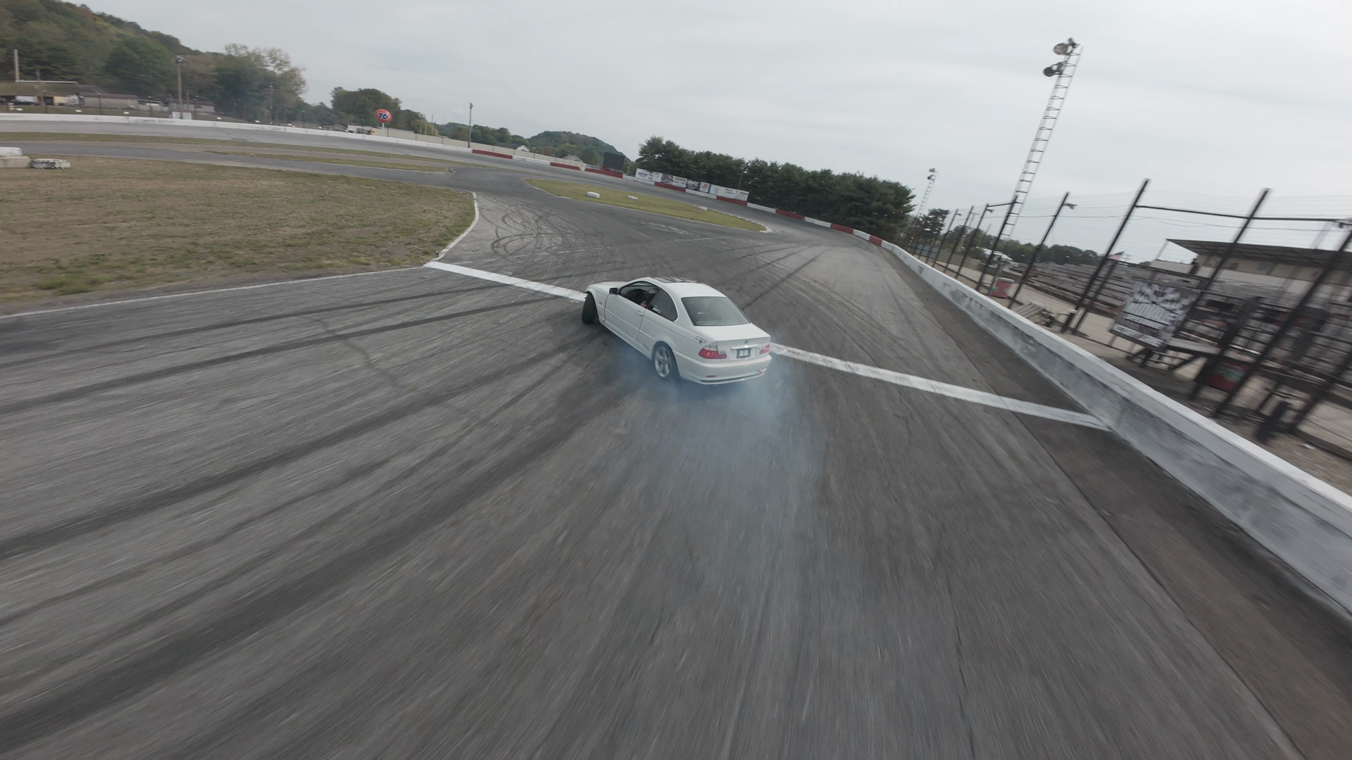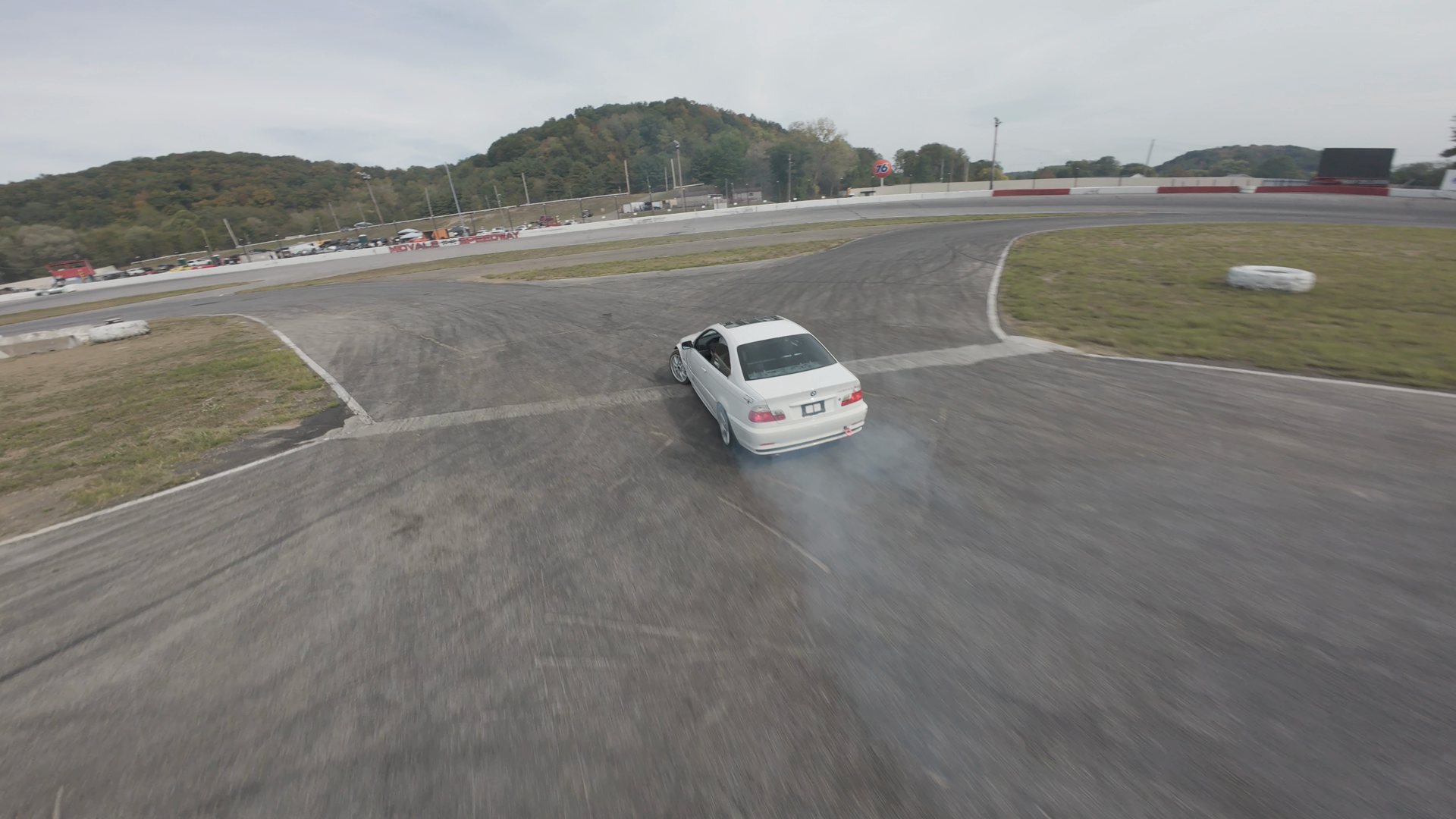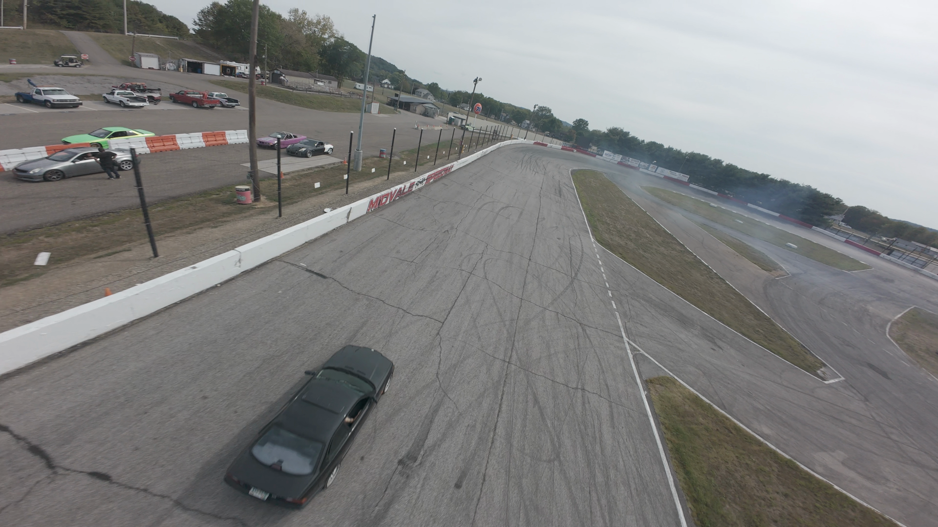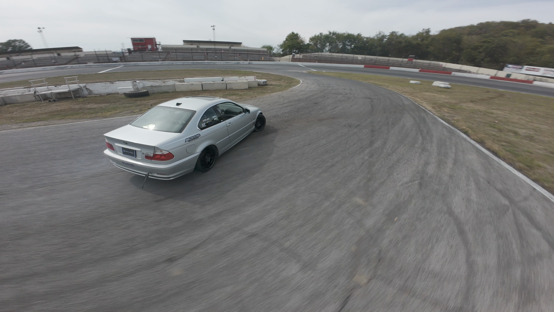 A black BMW M3 is captured from an FPV drone, speeding along the straightaway of a racetrack at Midvale Speedway. The car, a classic model with a dark finish, is seen mid-turn, showcasing its tires gripping the asphalt as it navigates the curve. The driver, obscured by the car's body, appears focused. The racetrack is wide with visible tire marks on the asphalt, and the surroundings feature greenery and distant hills under an overcast sky. The scene exudes a sense of motion and speed, typical of a professional racing event.