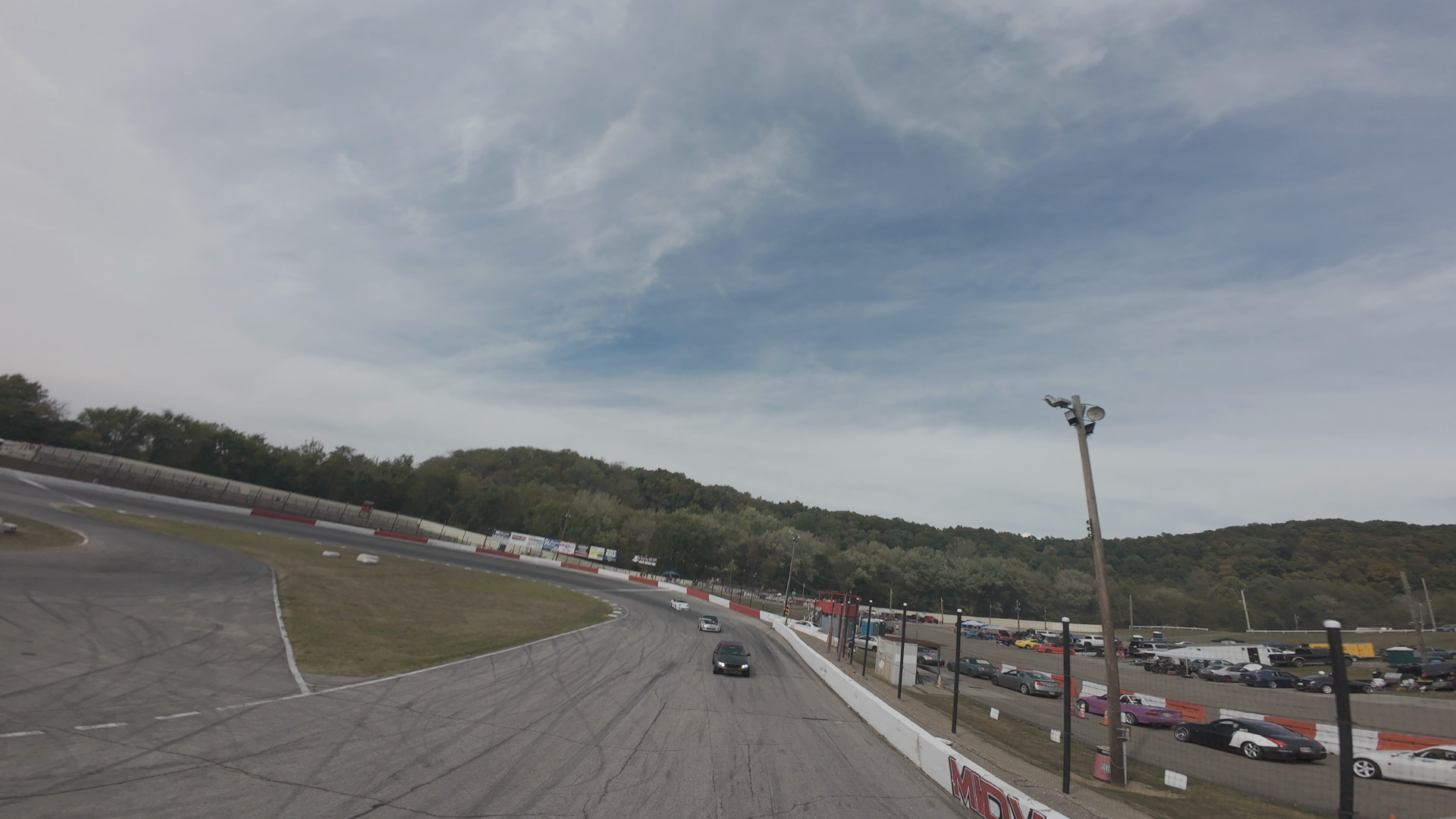 The image captures a wide view of Midvale Speedway, a racetrack location in Midvale, Ohio. The scene shows a series of cars parked along the edge of the track, with a striking green and white sports car prominently positioned in the foreground. The track is circled by safety barriers, and a clear but overcast sky dominates the background with some tree-covered hills visible in the distance. The landscape includes streetlights and sparse vegetation, with some vehicles and people visible in the far background. The environment reflects a typical sunny day at a racing venue, with an emphasis on the cars and the track’s setting.