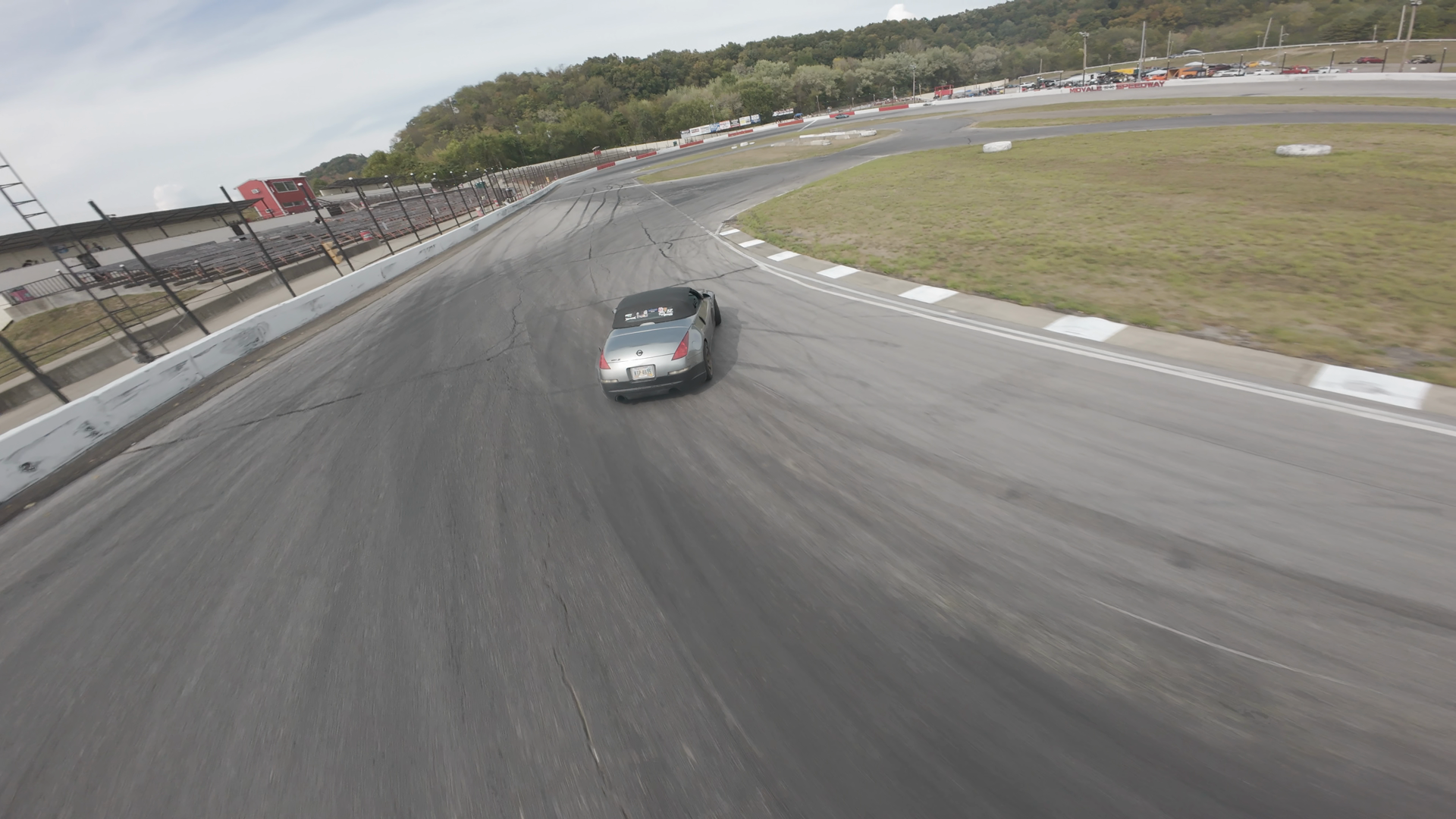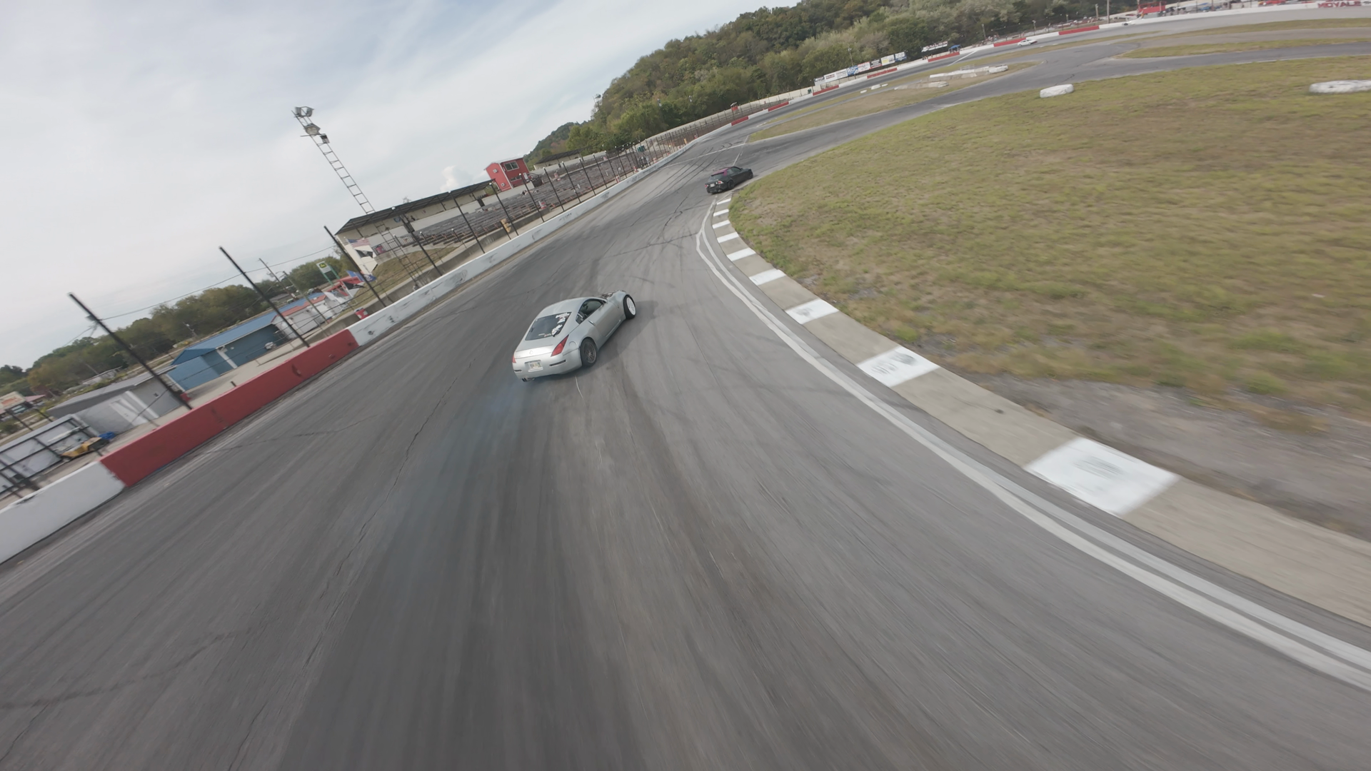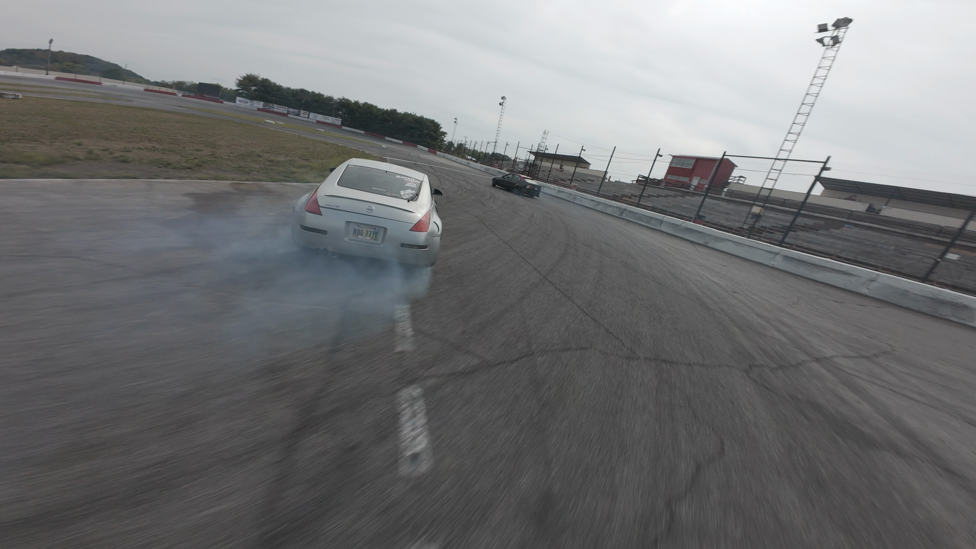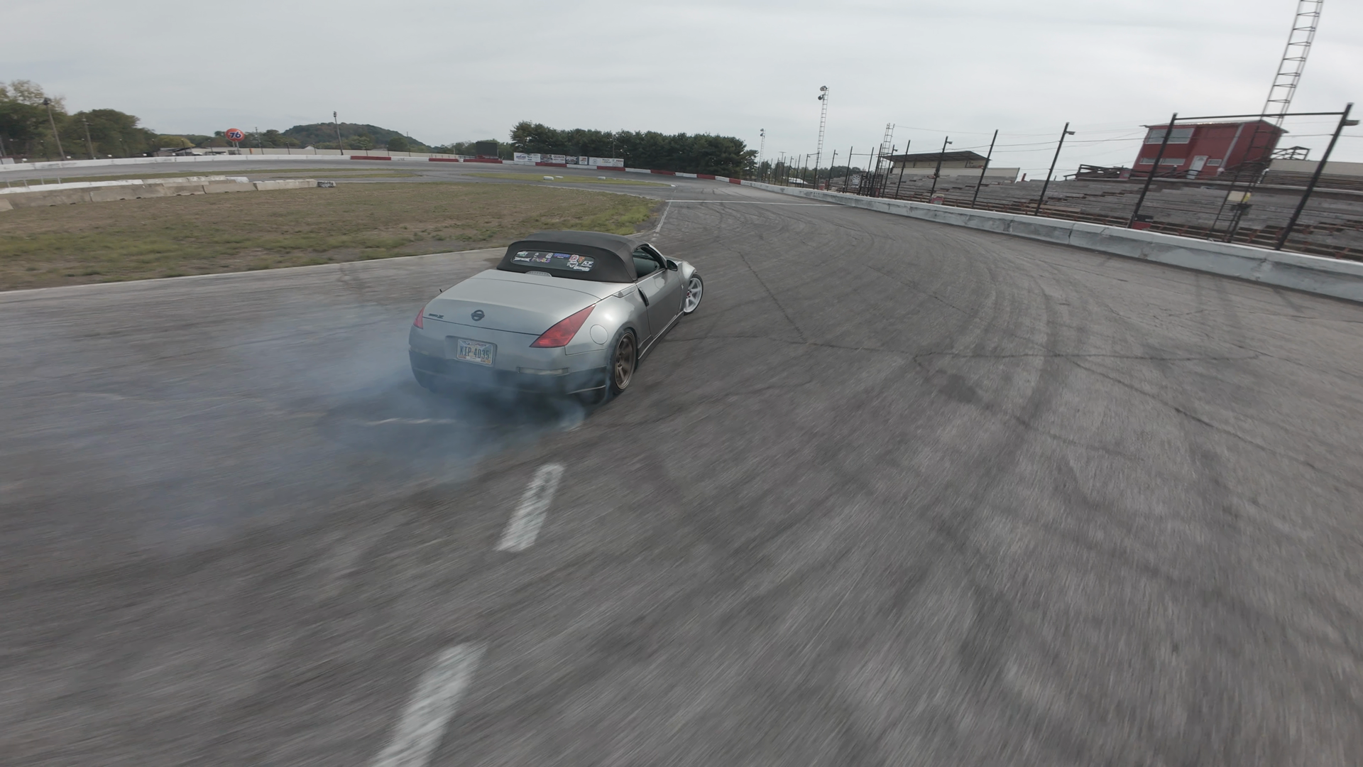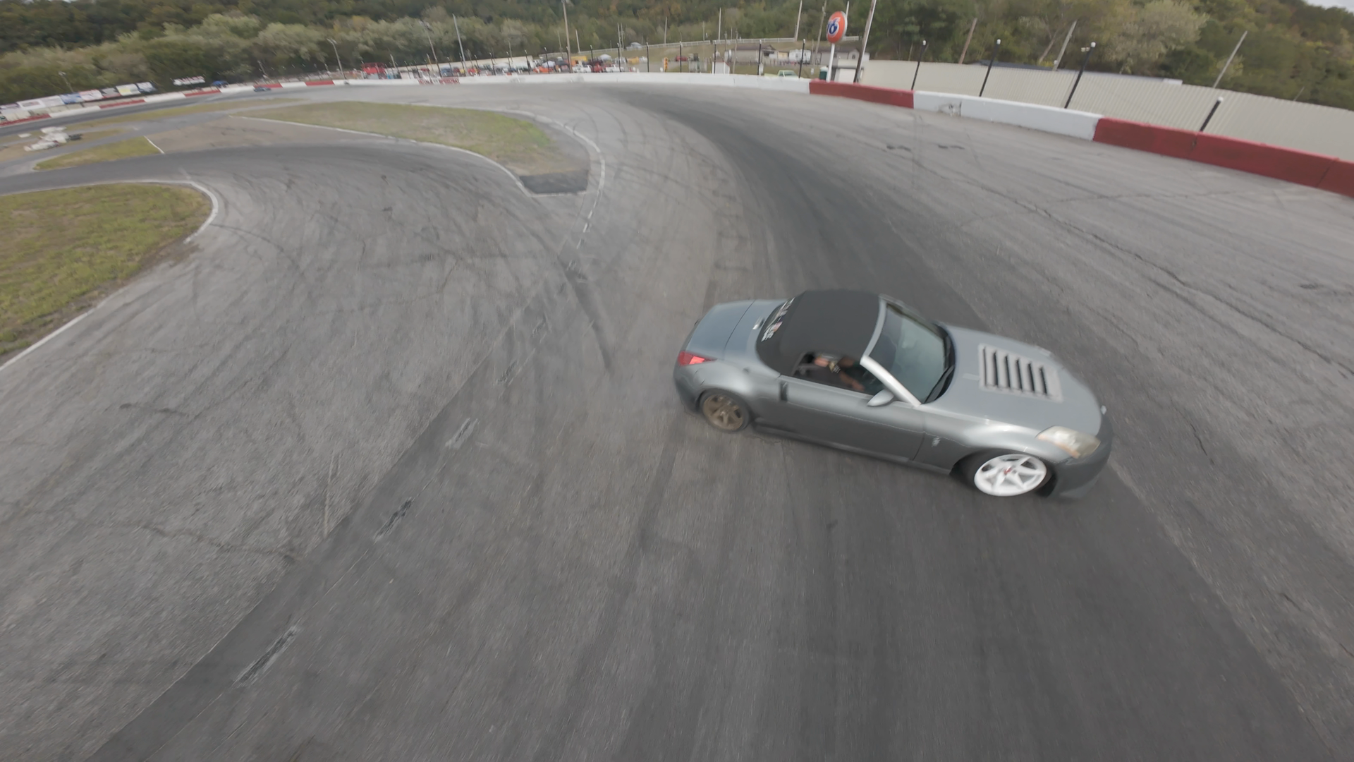 A silver Nissan 350Z with a visible license plate "410W" is drifting on an oval track. The car is leaving visible tire smoke as it maneuvers around the track, showcasing a drift maneuver. The track features a concrete surface and surrounded by a fence with some trees and hills in the background, indicating a suburban setting.