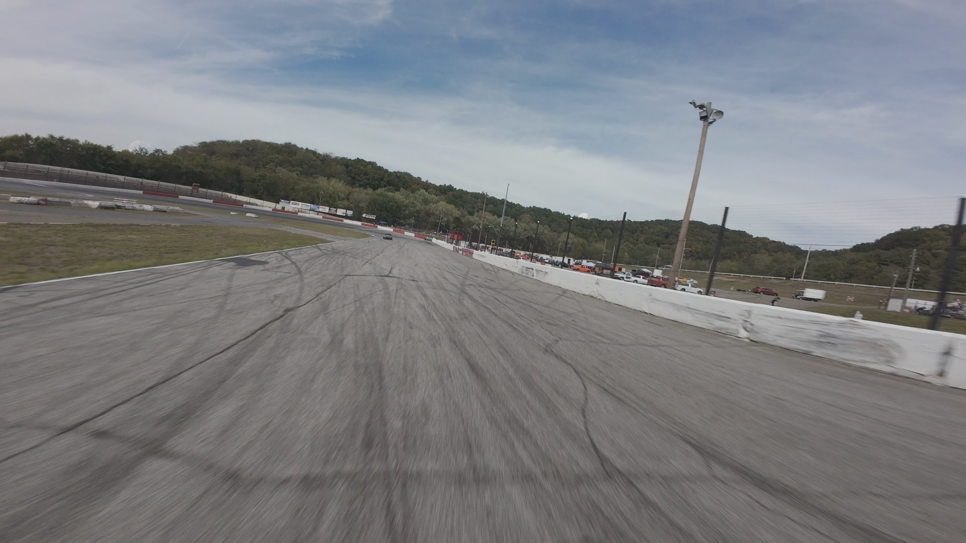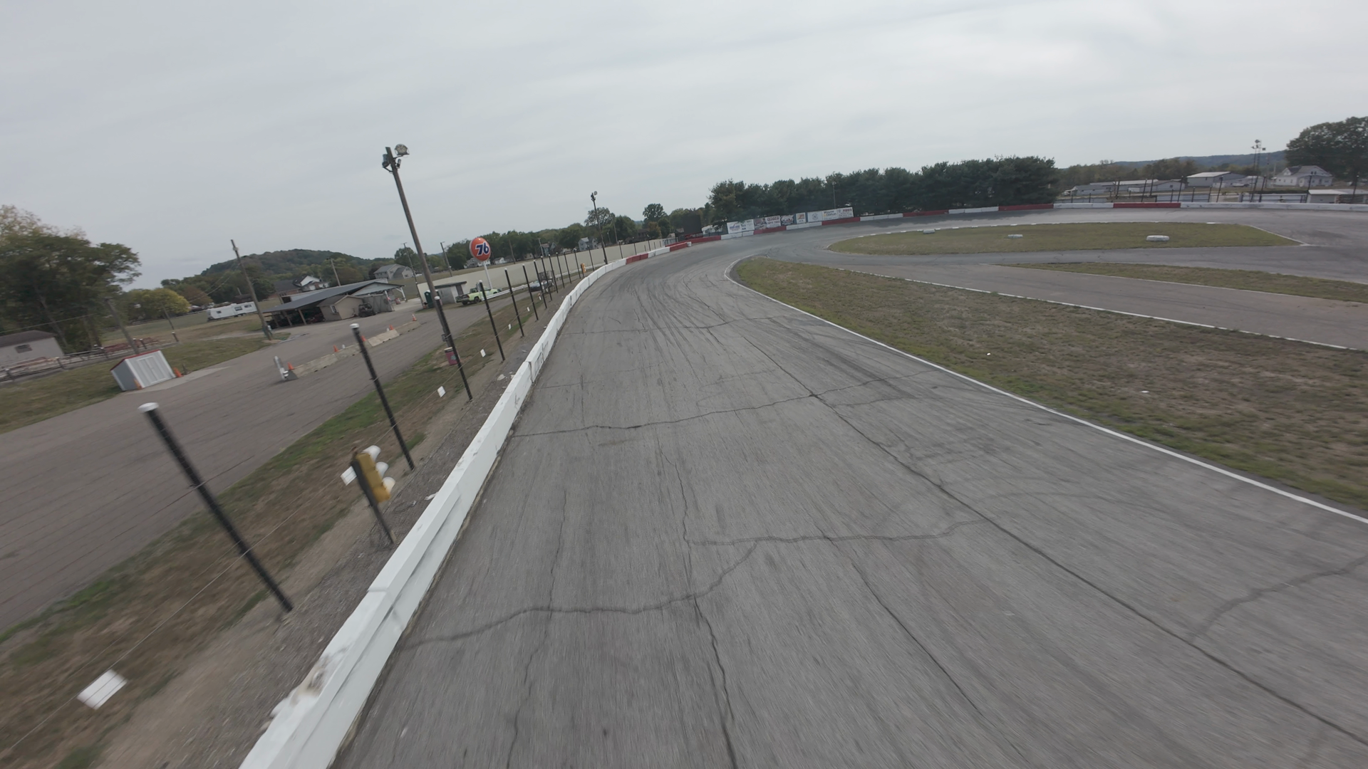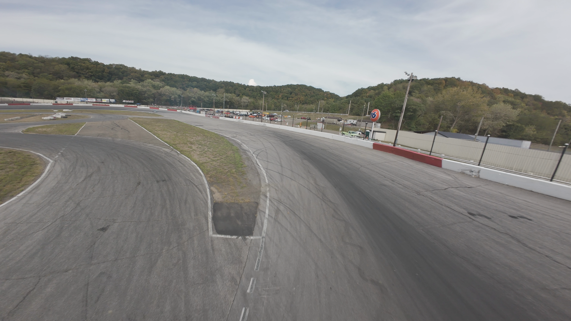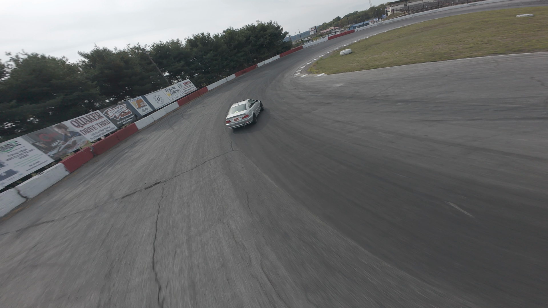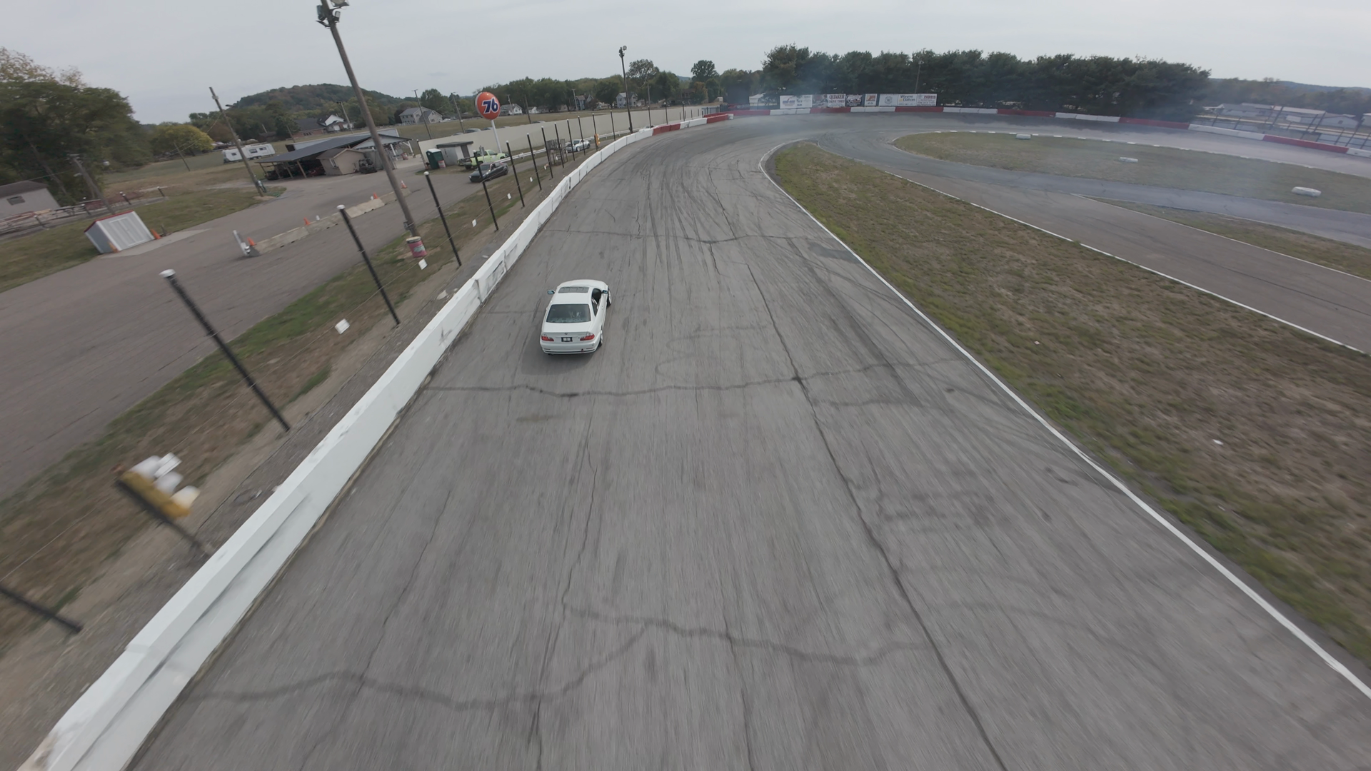 The image shows an aerial view of a white car traveling at high speed on a smooth asphalt race track surrounded by grassy patches and a concrete barrier. The track is devoid of other vehicles or racers. The scene captures the car's tire tracks on the road, and in the background, a few structures and overcast skies are visible. The car is stationary in the frame, as it appears in the process of racing or preparing for a session. The surrounding area is quiet, with no other activity noticeable in the image, suggesting a single-vehicle practice or race moment.